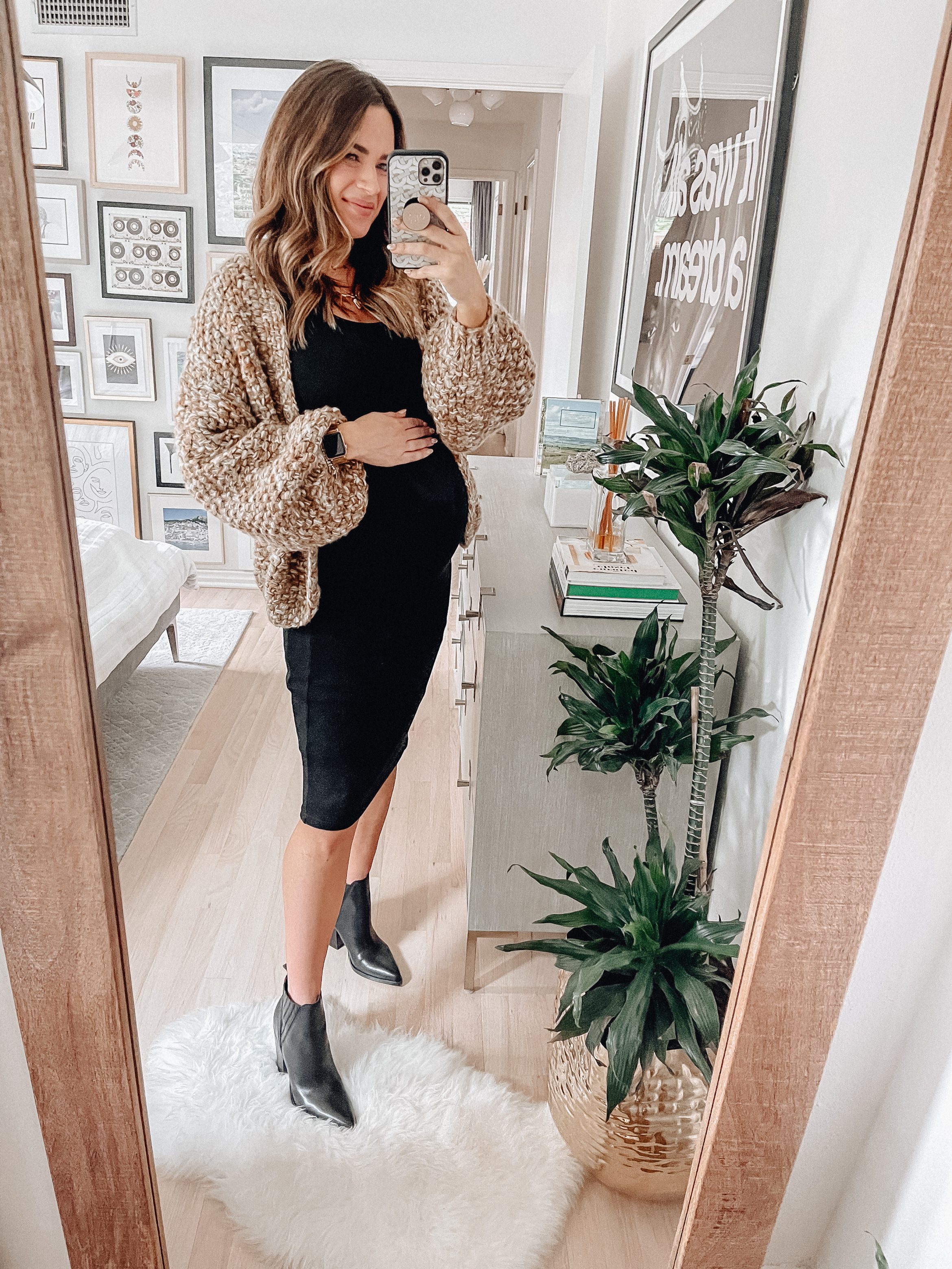 Dress (size S, sized up 1 for the bump) // Cardigan (S, they were out of XS, but fits TTS) // Booties (TTS)