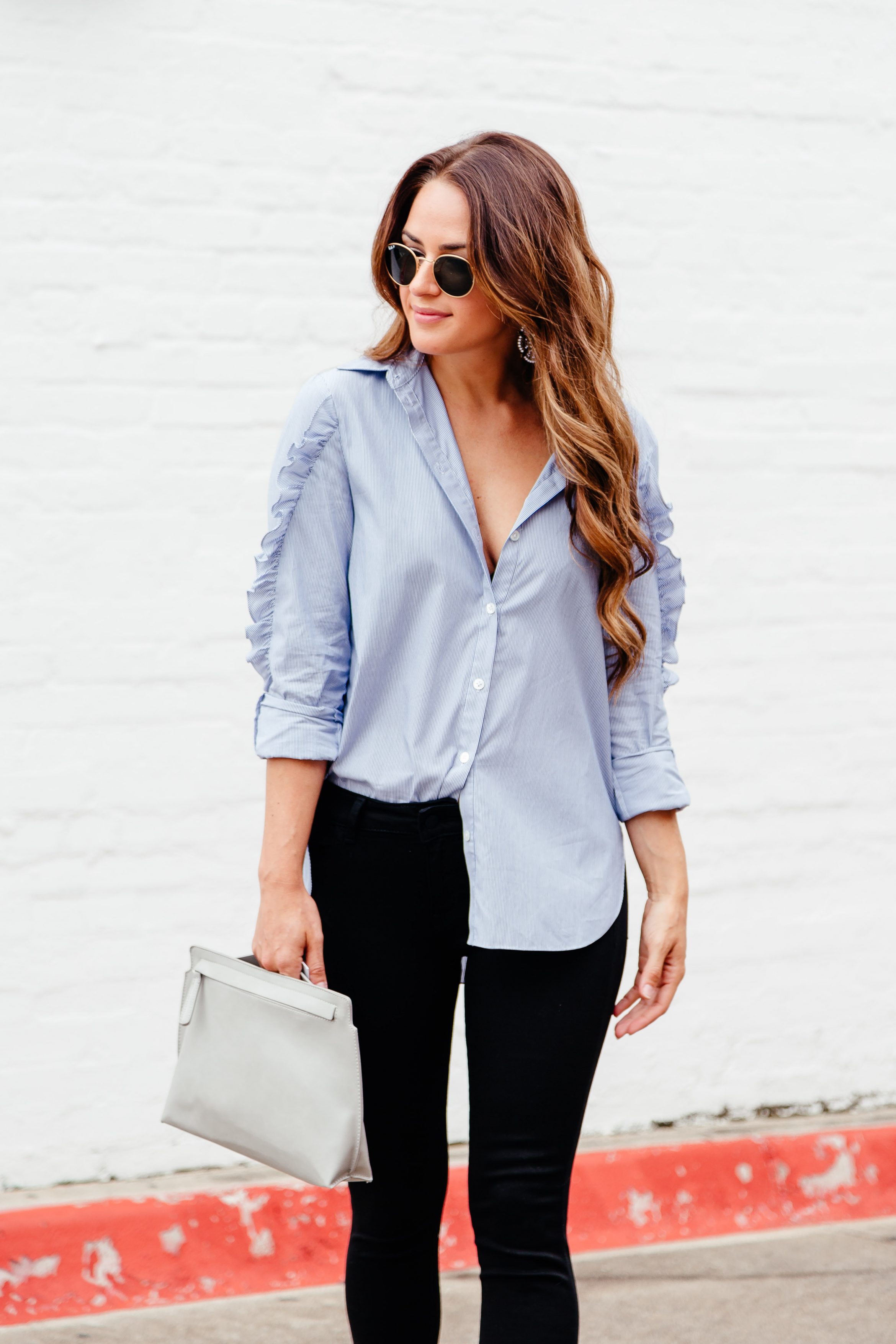 Take this top for example. Its a classic blue button down, but it has a little fun ruffle detail on the sleeves. I bought a small in it and went for a bit of an oversized look. I wore it unbuttoned a little here with a black bralette underneath and the sleeves rolled up for more of a relaxed look. This would be perfect for the office, too! It’s a little bit of a splurge, but I was so obsessed I thought it was worth every penny. I paired it with my new favorite black skinny jeans and this fun embellished heel. My jeans and shoes are both under $100 right now. I went with a clutch to keep it fun and finished off the look with my go to round sunnies. My clutch is under $30 and these sunnies are under $150. All of these items are a part of my closet staples that I am sharing with you below.