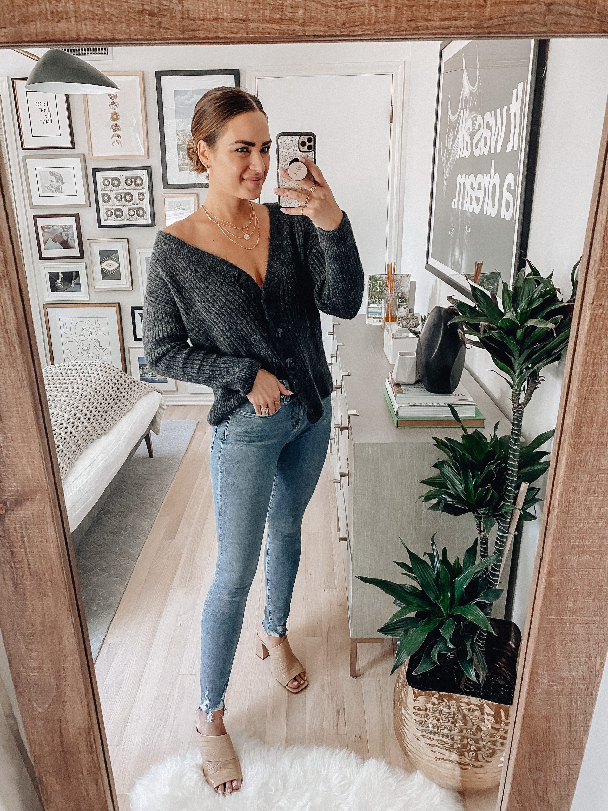 Seems simple enough, but wearing your cardigan as a top is a great option. It will look so cute inside if you take your jacket off, but works with it on, too. You can go so many different ways with this, but below I’m showing you under my favorite moto (which is on sale, too) for an easy go-to option.