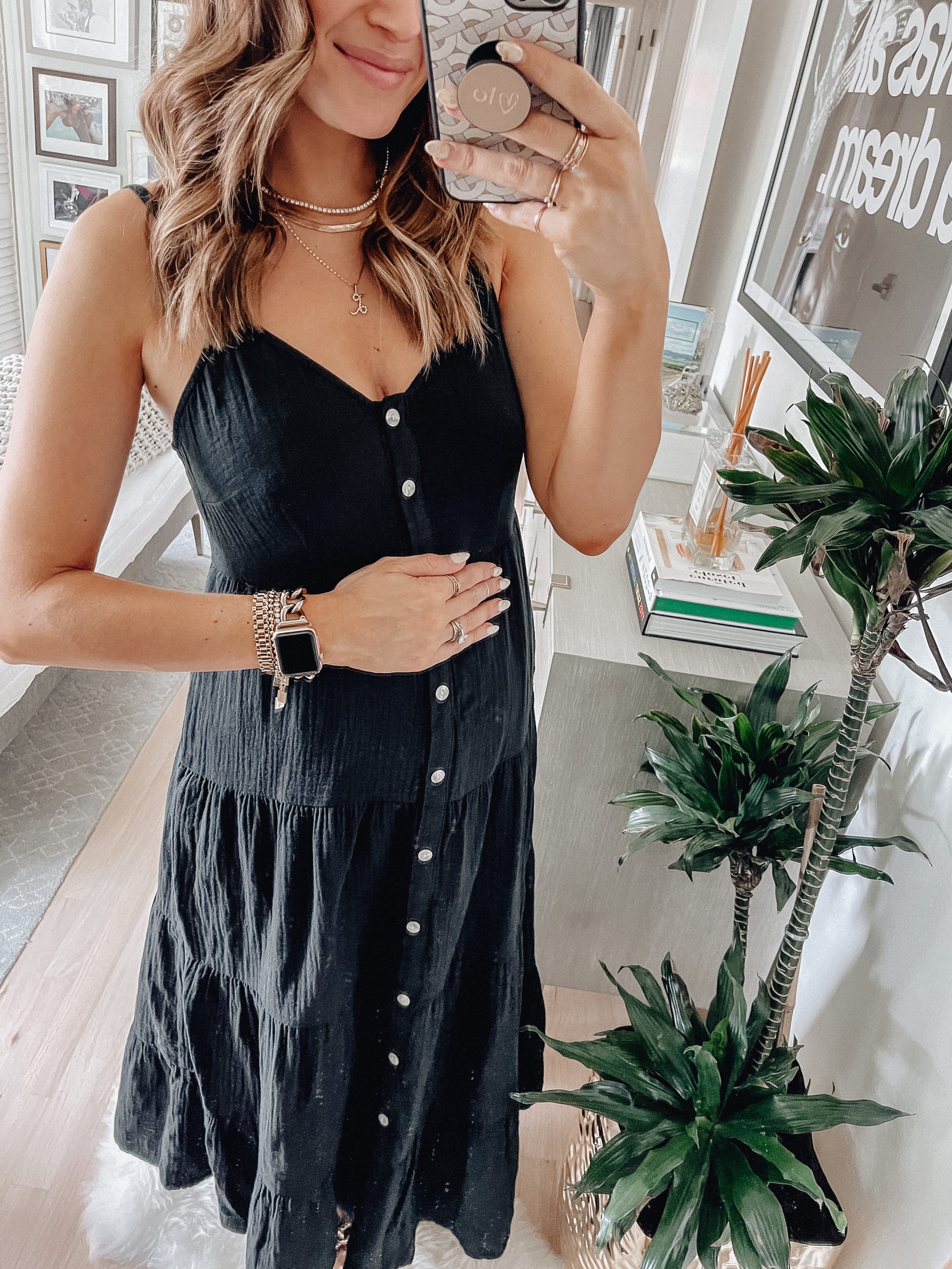 This tiered button down dress is such a good find! It comes in six different colors & is only $30. I am wearing a size small for the bump. It has adjustable straps & is a super lightweight, breezy fabric that is perfect for summer. The buttons down the front are such a nice touch & the best part is that it has pockets! I’ll definitely be wearing this one while nursing.