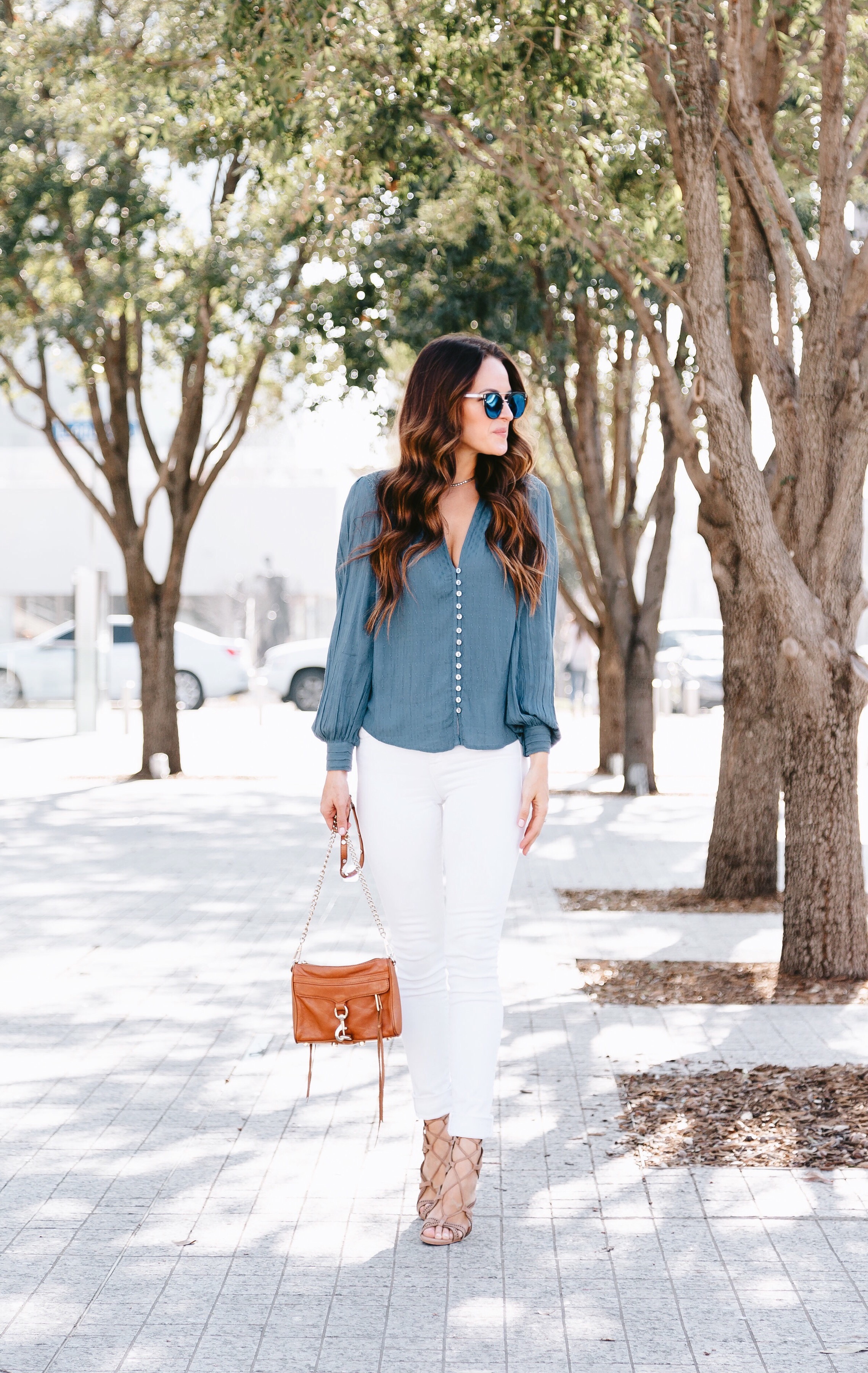 If you don’t have a go-to pair of white jeans, then I would for sure grab one of the two I linked above. They are my personal favorites and fit so well. I love having a classic pair and a distressed pair that I can rotate between. I can luckily wear the classic pair to work, but have to save the distressed pair for nights, weekends, and summers off. I’m actually on a hunt for a new distressed pair (anyone else the queen of staining white jeans?!) and have my eye on this pair and this pair. Any white jeans go perfectly with these shoes. The block heel makes them super comfortable, they also come in black, and are currently on SALE!