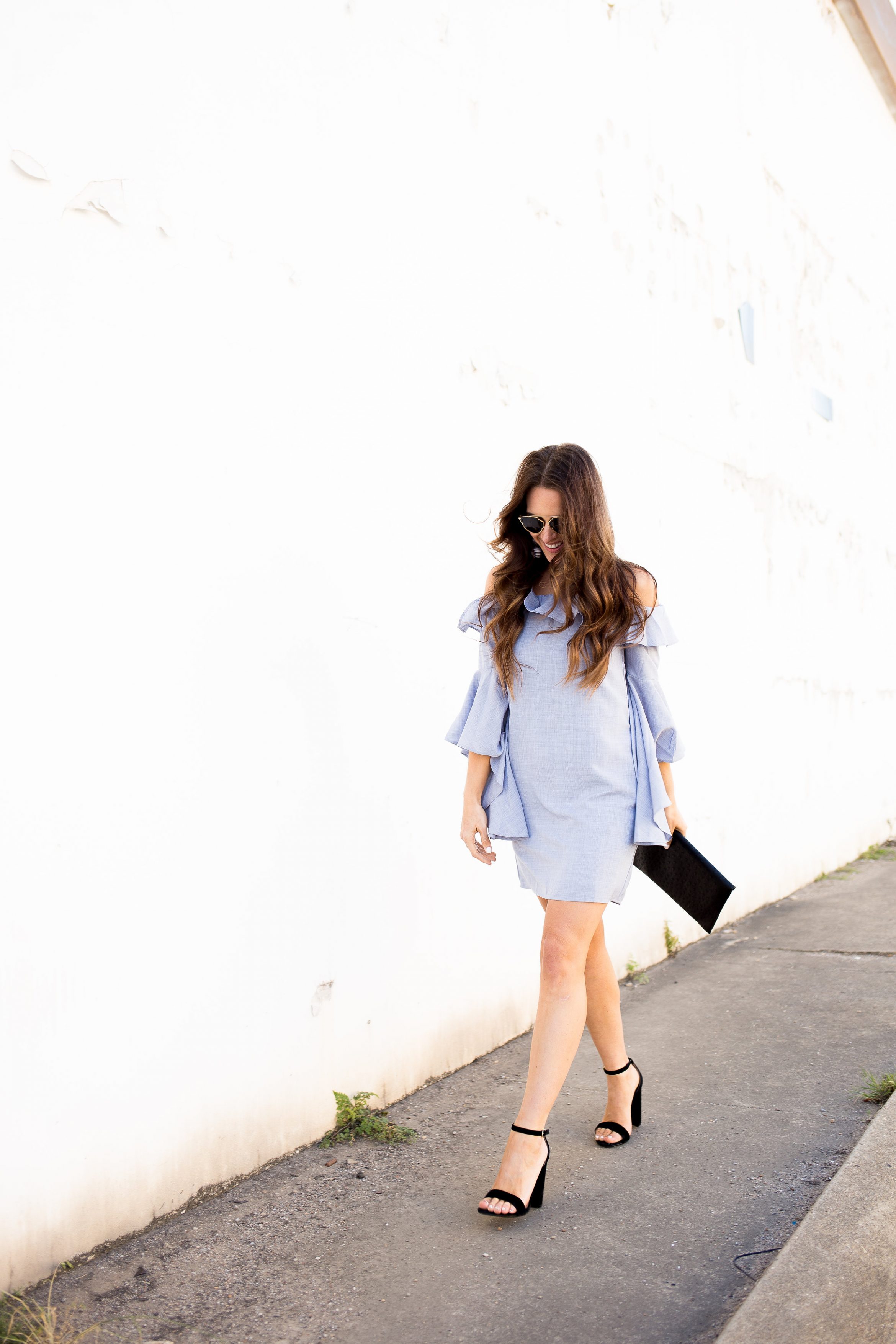 How fun are these sleeves? I couldn’t help but flutter them around. I’m loving the statement sleeve trend this Spring (see this post). It takes an otherwise classic piece and subtly adds a fun little trendy aspect. I tend to wear this shade of blue with white, especially in the Spring, but I wanted to darken this up and wear black accessories. I thought the black would be a nice contrast to the feminine ruffle details of this dress. I looked at a brighter statement earring for this dress, but wanted to keep it more classic so I went with these black and white stripe drop earrings. These come in like 12+ colors and are the perfect addition to any outfit. If you’re wearing a statement shoe or bag, these earrings are the perfect way to coordinate or to add a statement all on their own.