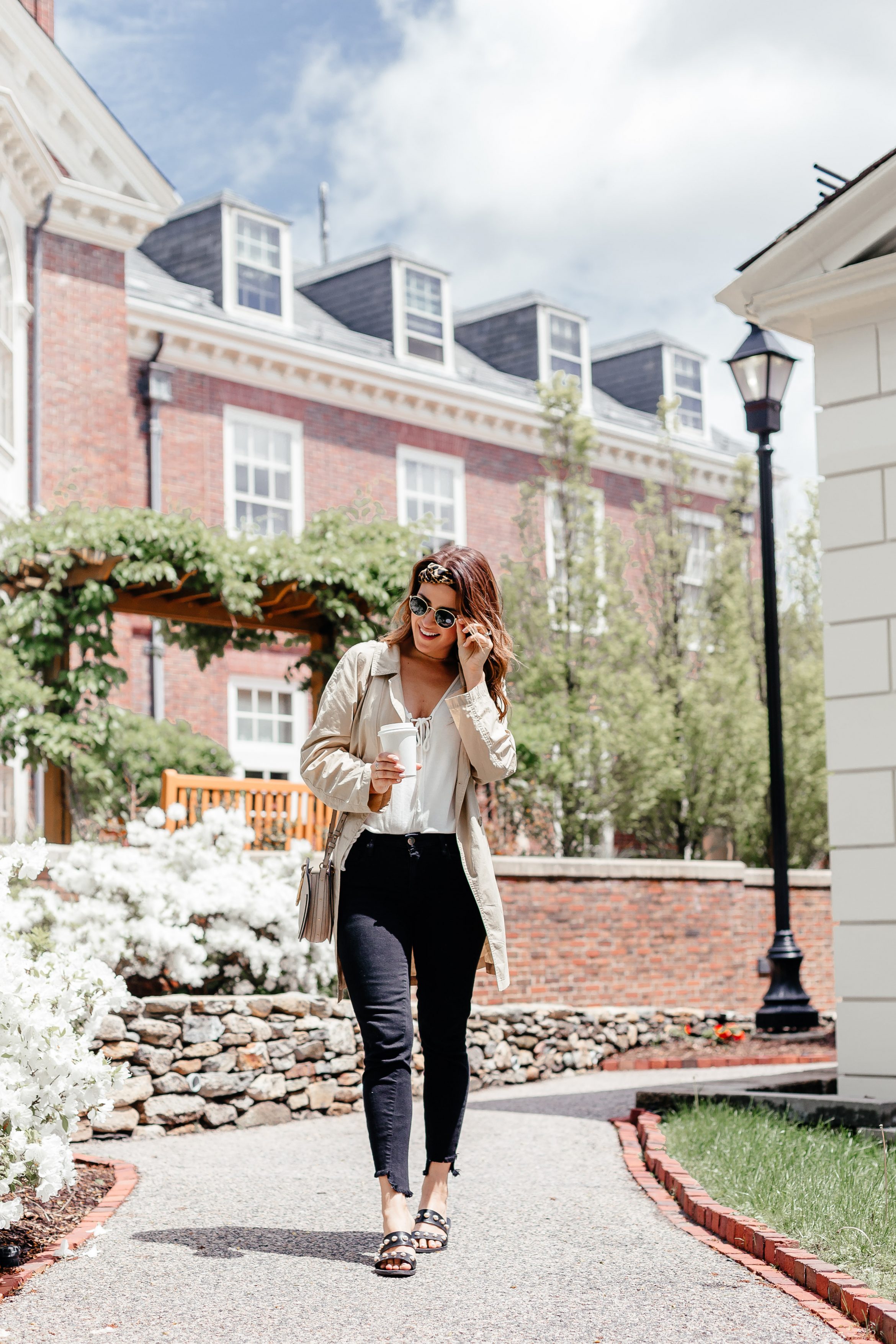 I was in need of some new rain gear and this trip to Boston was the perfect excuse since I knew we’d be walking around and both Friday and Saturday had rain on and off in the forecast. I love a classic neutral trench and this one is light weight enough that I’ll be able to wear it year round depending on how I layer under it. Plus, it was on major sale. I got this cute umbrella, too. It has little black rain drops all over it and says ‘rain check’ randomly on it. I also love this ‘rain check’ one, but it wouldn’t have been as easy for traveling. I’ve always loved a classic trench and white jeans, so I threw this pair in and kept the rest of the look neutral. It was an easy outfit for walking around and exploring on Saturday.