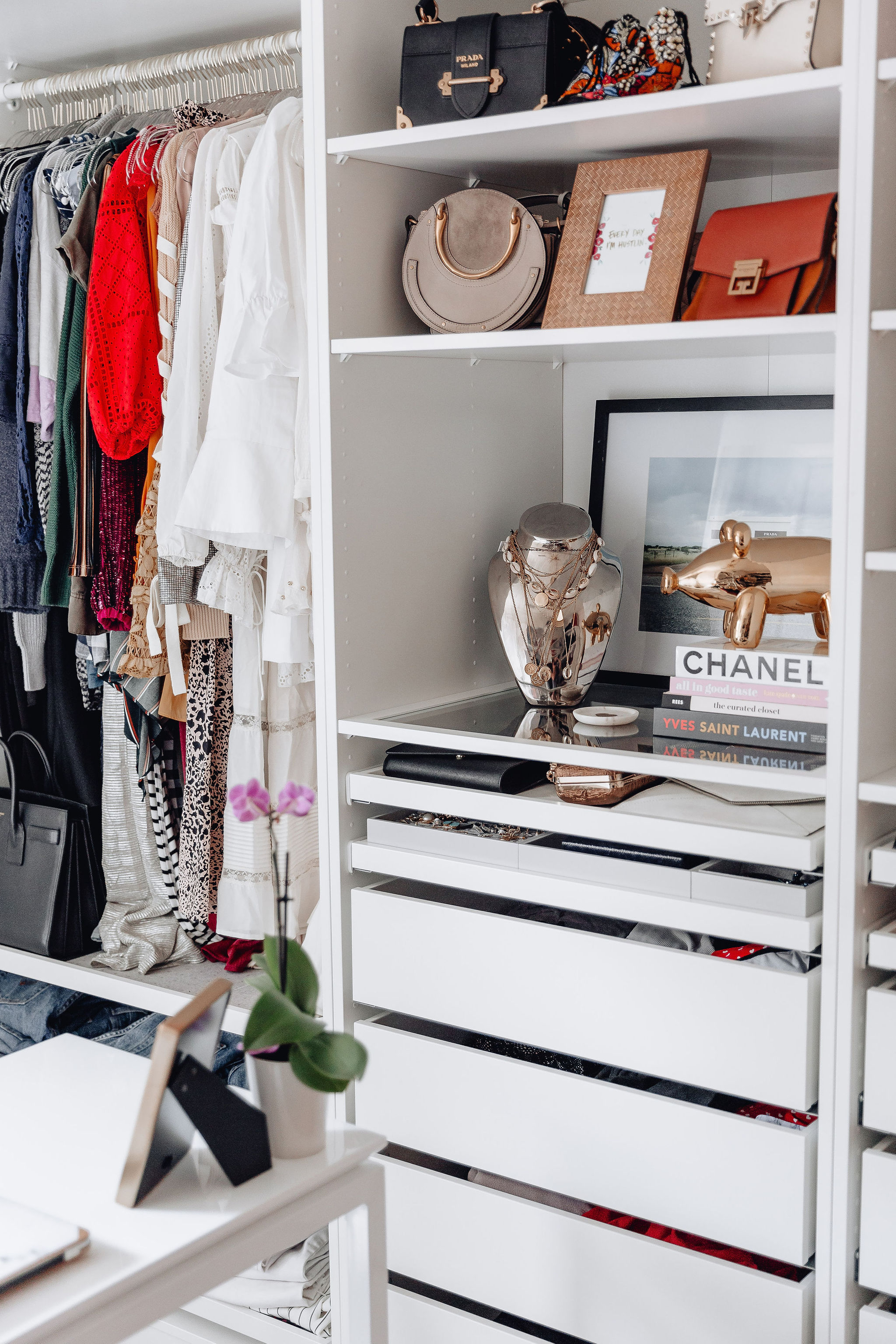 I knew that I wanted to work with IKEA Frisco on my closet design process. I had so many photos of the IKEA PAX wardrobe system saved on my Pinterest inspiration boards that I kept coming back to. I love how completely customizable the PAX is based on your individual needs & what space you’re using it in. I shared an entire blog post about my closet design process with Ikea where I gave more insight into working with them in their Design Center & the installation process. I absolutely love how everything turned out & how perfect the design is for me!