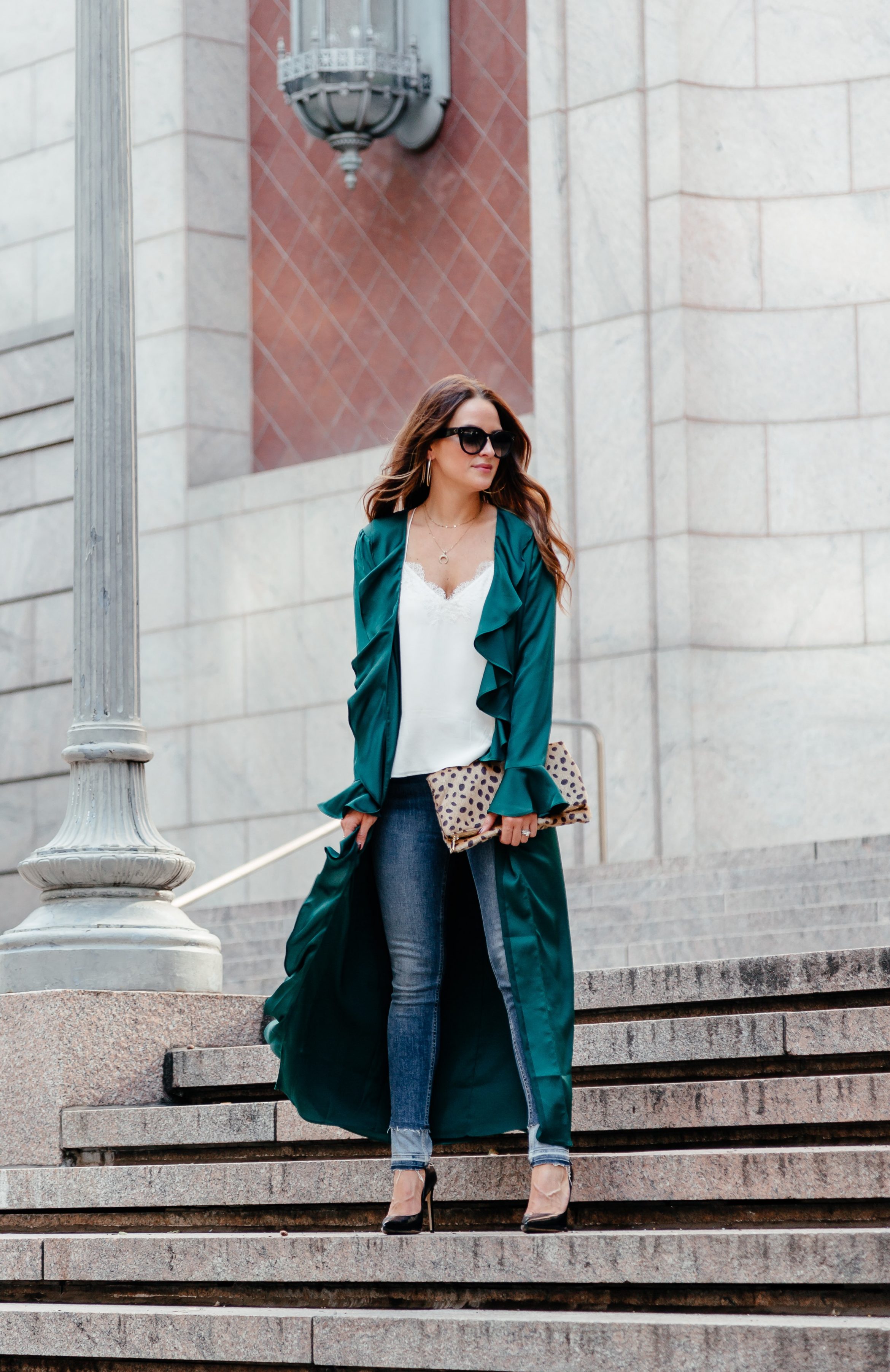 I found a major ‘steal’ version of my leopard clutch that you can snag for under $50 here. I love the way that leopard looks paired with emerald green! Such a fun combination.