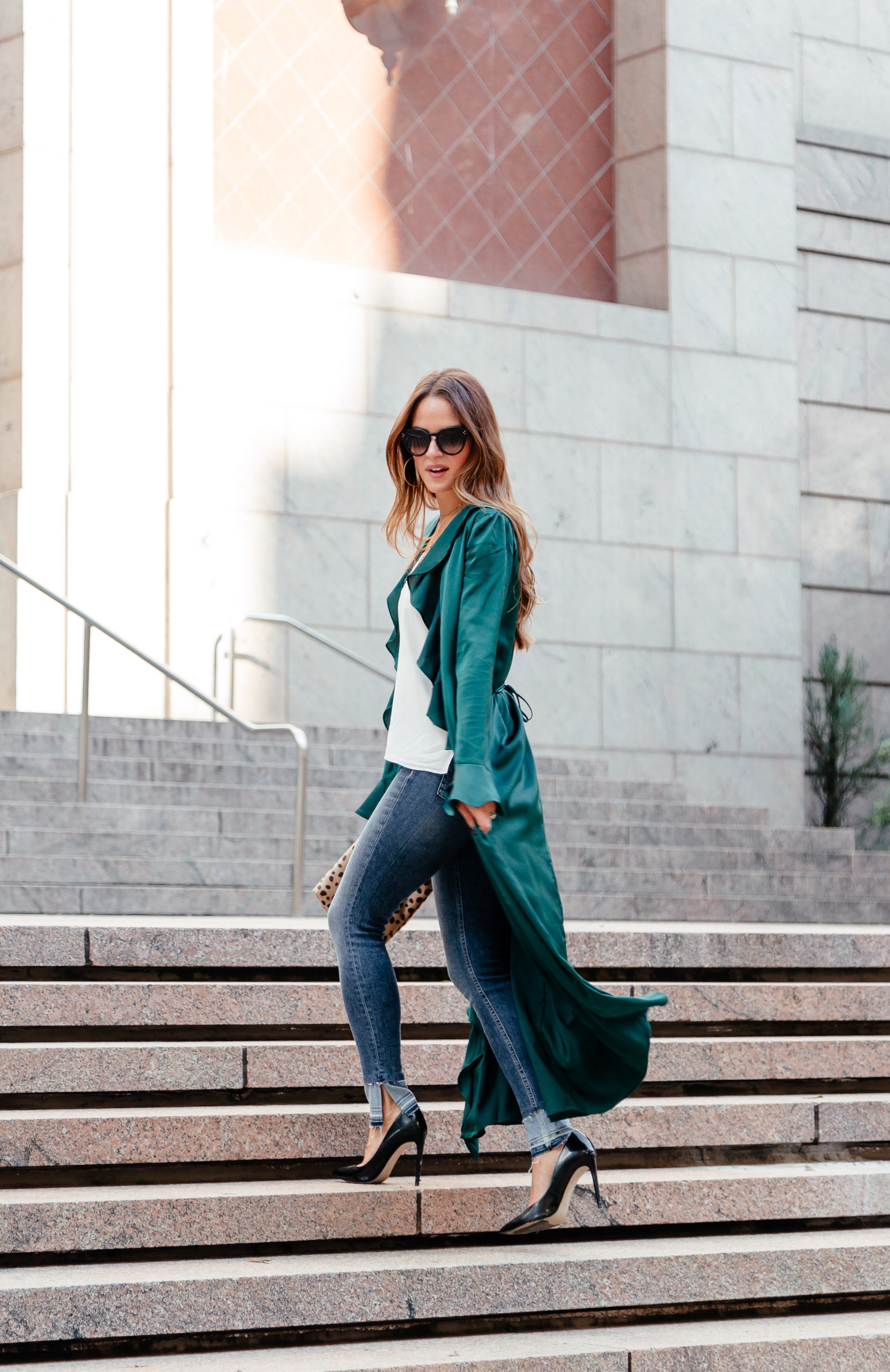 Sometimes you just want to make a statement. Often times, people wait for an occasion such as a trip or a special night out. I don’t like spending my life waiting. I think we have to make our own opportunities and getting dressed up just because I feel like it is excuse enough for me. I’m loving the statement that the duster jacket can make. You may recall I wore one during fashion week (as seen in this post) paired with a neutral slip dress. I kept it neutral, so while the look made a statement, it was a more subtle one. I saw this green duster jacket and loved that not only the style of the duster jacket, but also the bold color for Fall made a statement. This one also comes in a gorgeous marigold color and I truly went back and forth three times trying to figure out which one to order. I settled on this one and may end up with the other soon, too.