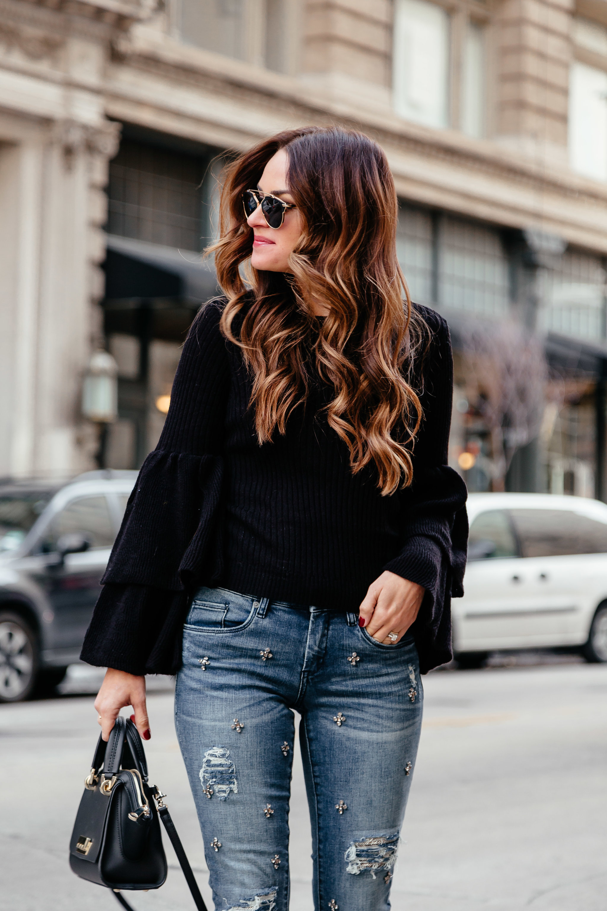 My advice is to let the embellished denim be the star and to keep the rest of your look pretty simple. While I do have statement sleeves, my sweater is black and sort of blends with the accessories in my look so the denim can shine. There are so many ways to style the embellished denim trend, but I think the overall key is to let them shine! Basically, don’t wear a pair of jeans with sequins on them with a sequin top. We don’t need embellishment or sequin overkill.