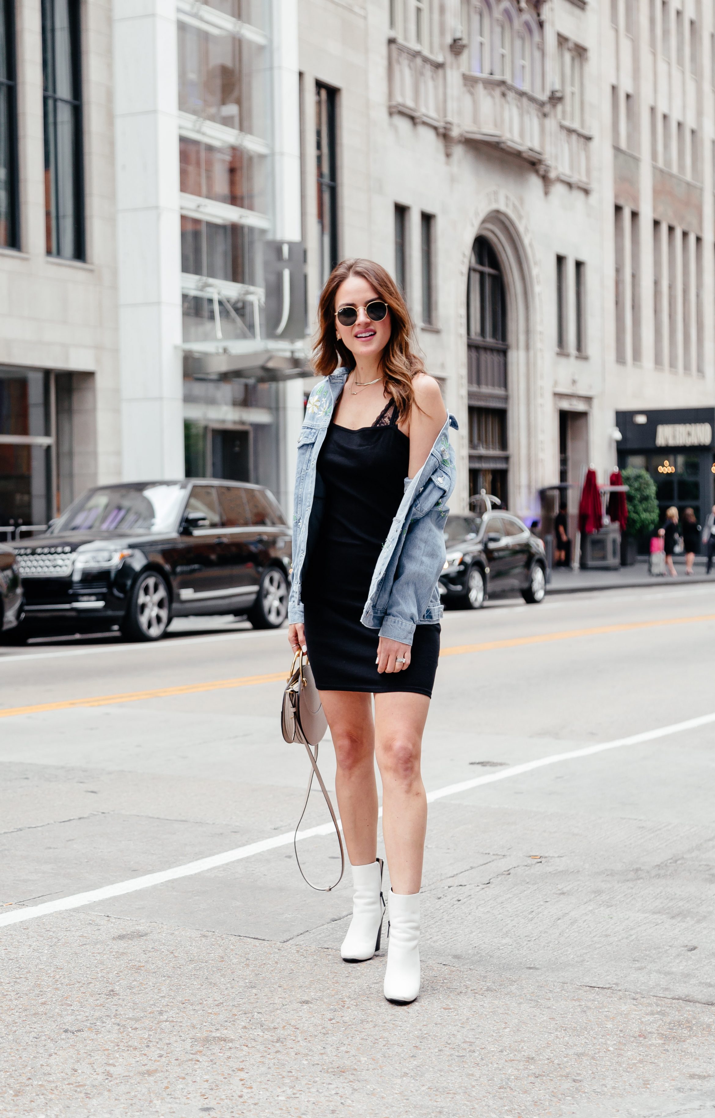 First, let’s talk more about this look. I have been seeing embroidered denim jackets around and really wanted a fun one for summer. I’m always cold, so I keep jackets with me on the reg during the summer because everywhere is freezing to me inside. I loved that this embroidered denim jacket also had a slogan on the back. I love all things graphic, because finding the perfect little slogan makes you feel like something was just made for you. I loved the oversized fit of this jacket, so I paired it with a tight little tank or slip dress. This one is cotton and is so darn comfortable. I wanted the look to be a little on the edgy or cool side, so I paired it with my new favorite bag, my white booties, and round sunnies. In my opinion its a great mix of festival, summer, cool, and easy vibes.