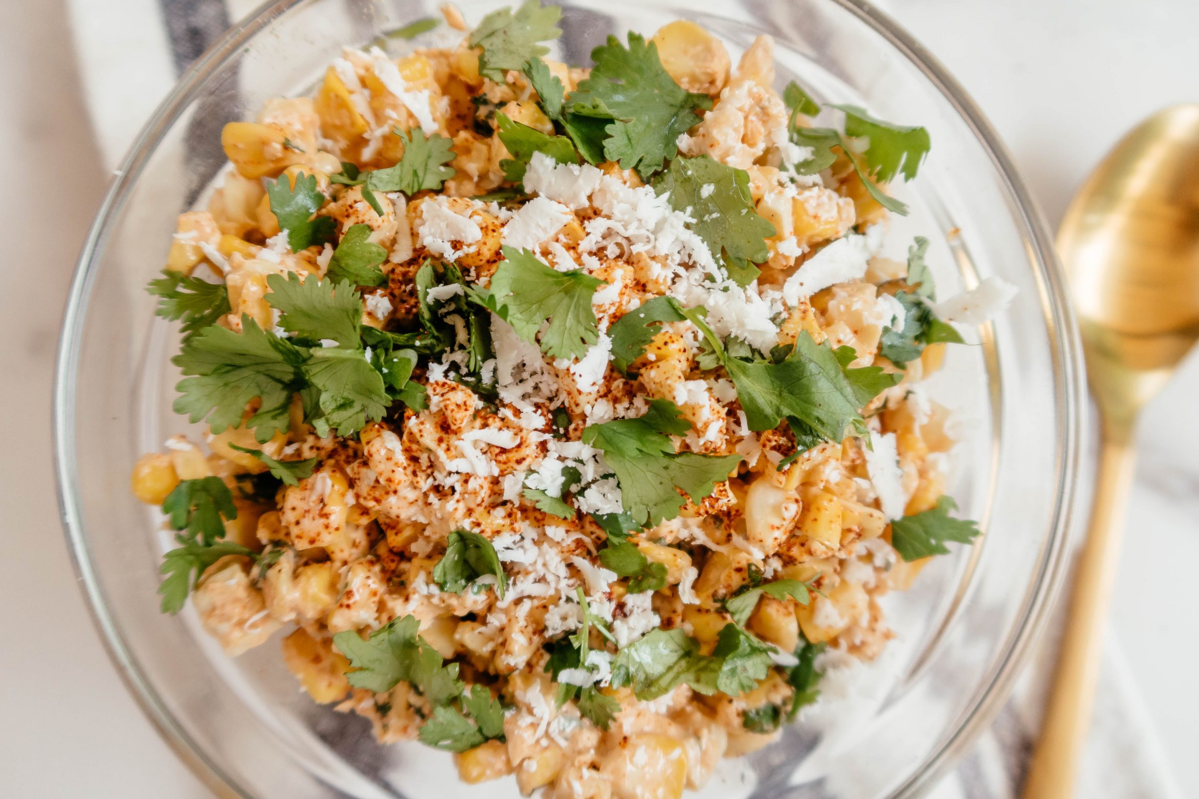 Your dish looks great!!! When Mexican corn on the cob, “elotes”, is removed and then toppings added, it is then called “esquites”, a fabulous take with you treat sold by many Mexican street vendors. ¡Qué rico!