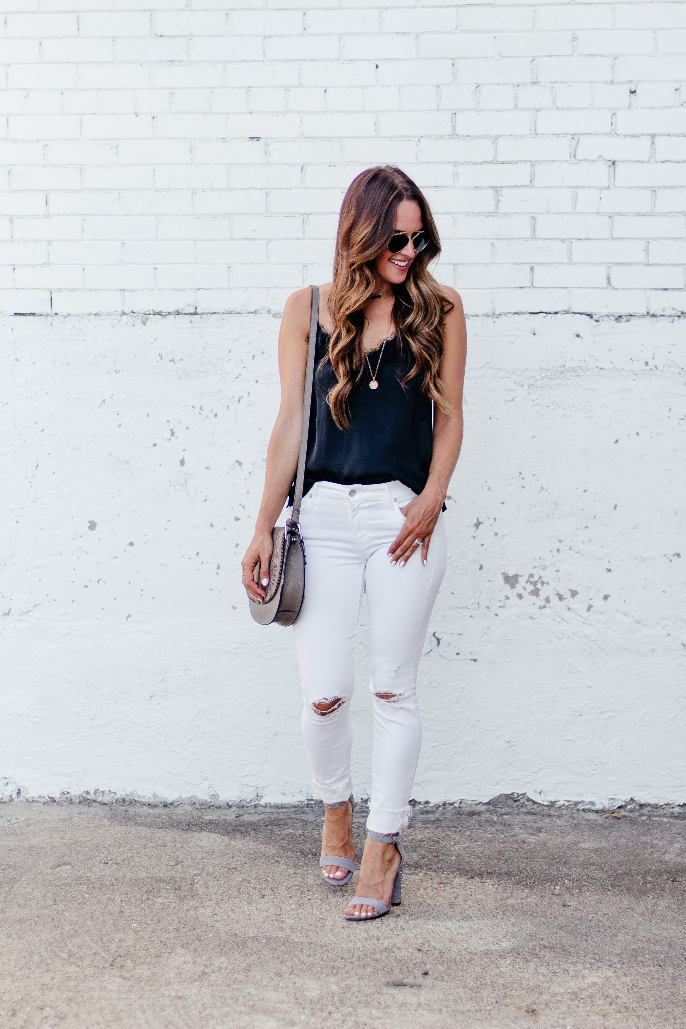 This cami top is seriously one of my favorite purchases not only from the sale, but in the past few weeks. I’ve already worn it so many times! I have it shown below in white on my under $50 collage. It also comes in a gorgeous emerald color and is under $32. I’m wearing an XS for reference. You may recall my love of cami tops from this post, but the reason I love them so much is because you can wear them year round and they are so versatile for almost any setting depending on how you layer them. My shoes are also on sale! They are under $100 (usually $150), also come in black, and run true to size. I’ve been asked a few times if they are comfortable and my answer is absolutely! They have a thicker block heel, which I love because it gives your foot more support and allows me to wear them all day and night without a problem. My bag comes in three colors and is on sale for under $165 (usually $250!). I love the saddlebag style and the stitching detail on it is so pretty. My jeans and accessories are not currently part of the sale, but I linked them for you. These jeans are my favorite white pair everrrr. I sized down in them because they do have a good amount of stretch!
