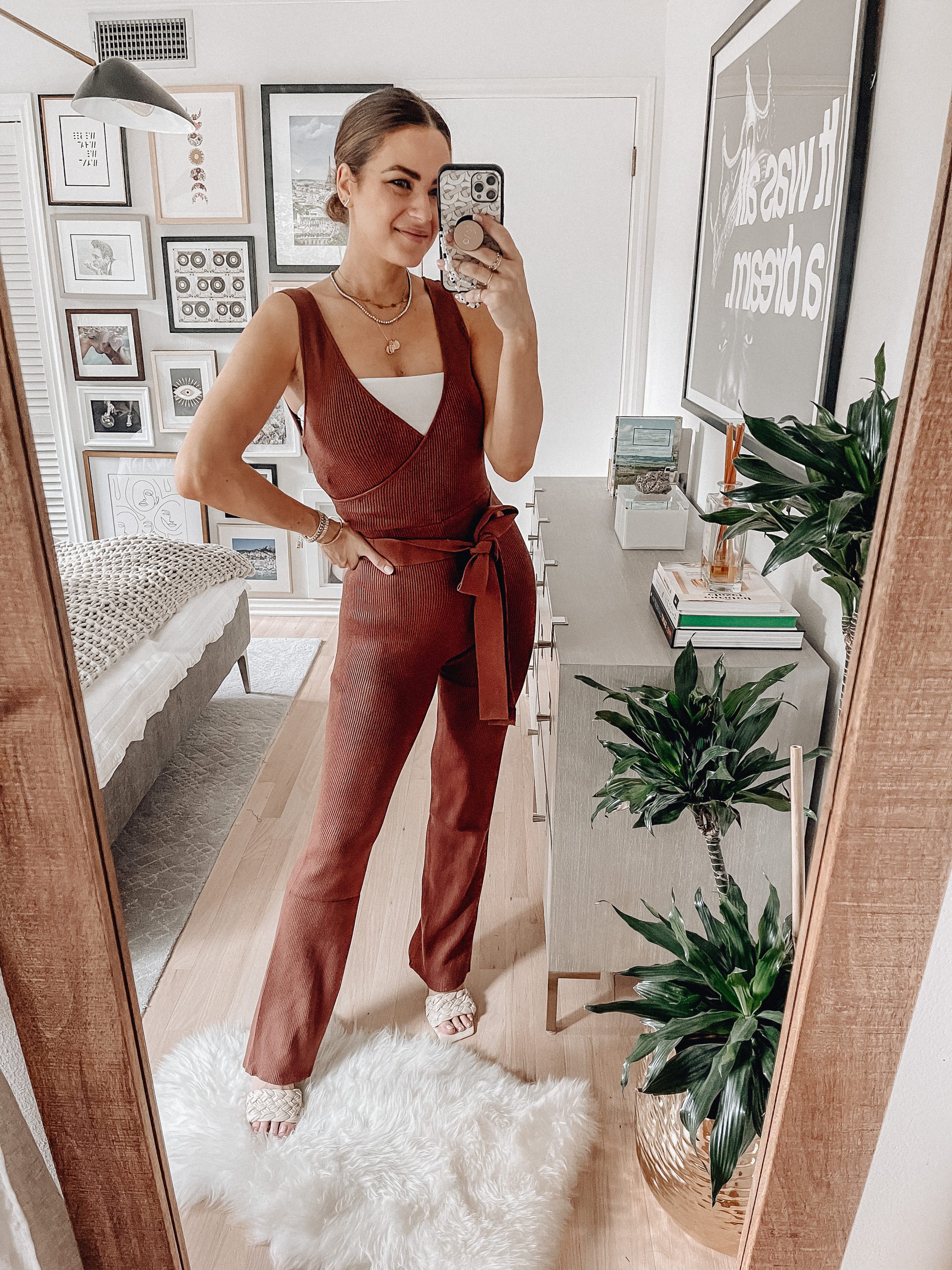 Jumpsuits are a one hit wonder. I love them because you can so often dress them down with sneakers for day time or dress them up with heels. They look great layered under denim jackets, blazers, moto jackets, or even cardigans!