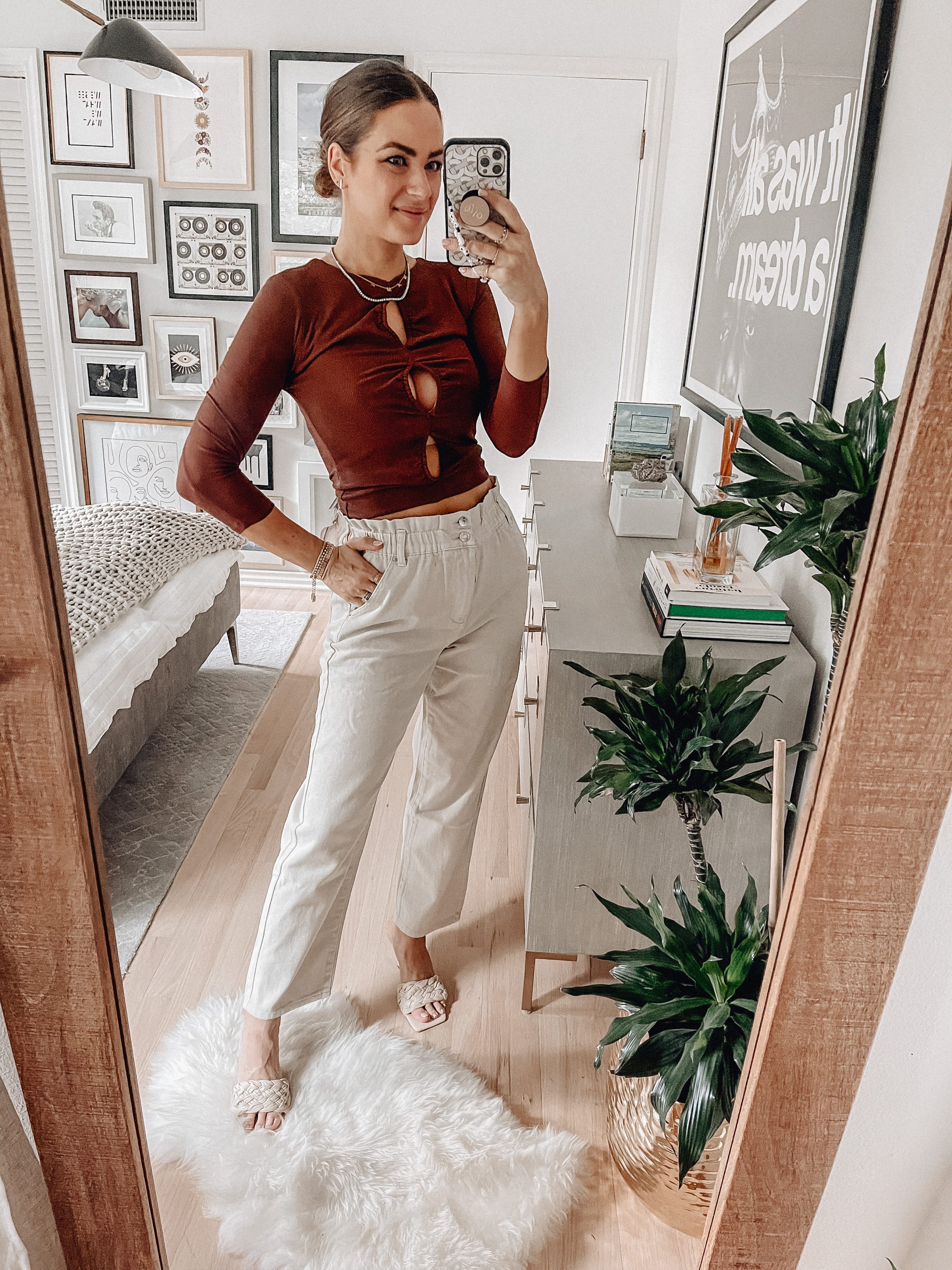 While crop tops trending may make you cringe (I feel ya, I’m just 2 months postpartum over here), hear me out. Crops are definitely in style this fall, but they are trending with high waisted bottoms so you aren’t fully on display with your stomach like Britney in the early 2000s. Pairing a jacket over them, especially one like an oversized blazer, is the on trend way to style them that I can get behind.