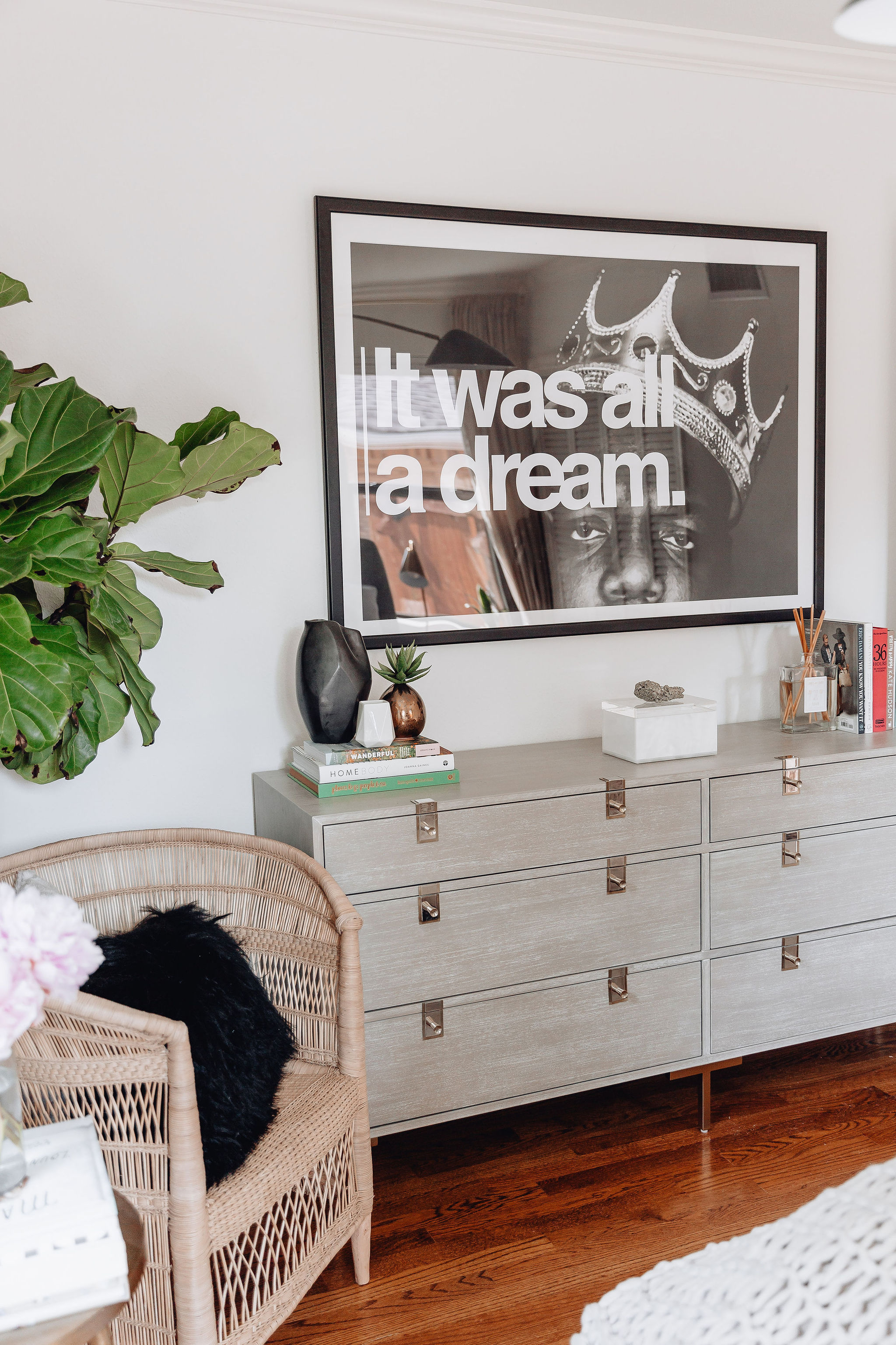 “Where is your Biggie picture from?” is one of my most asked questions. The exact print is one I ordered years & years ago for my husband from an artist in the U.K. I have scoured through my e-mail trying to find details on the exact one & have not been able to. I have found an almost identical one HERE that I always link for you all though. It is much more affordable than the one I purchased & looks so similar. We took the print to be custom framed. It hung for years over our bed, but we moved it into the guest room when we moved into our house.