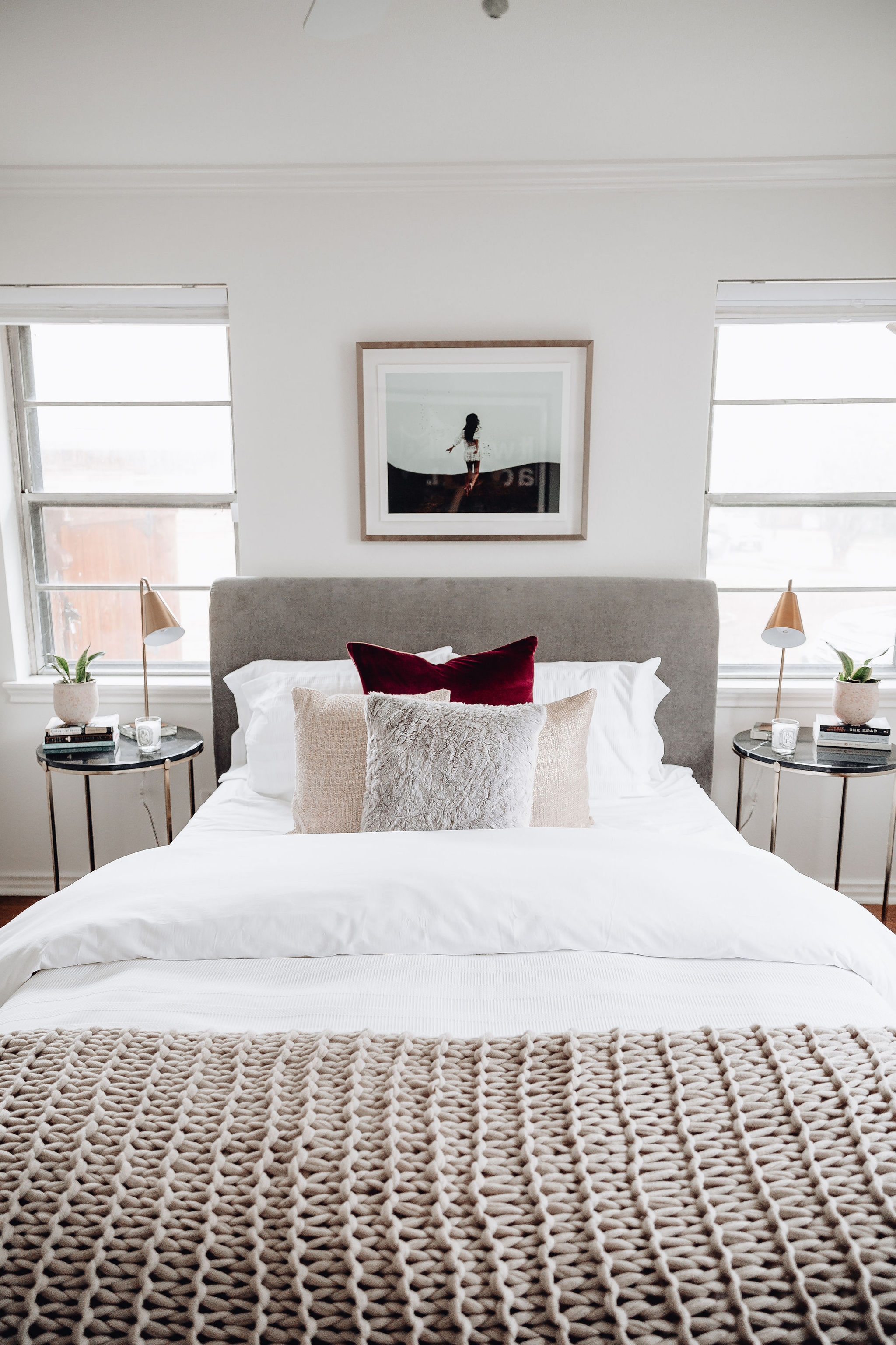 I almost always go for white bedding. Because we knew we’d have white bedding, we wanted to go with a darker grey bed. I found this velvet one with gold hardware & was in love. It’s so gorgeous! The bedding we chose has a subtle white pattern, which gives it some fun texture. We wanted moody tones in the room, so these deep burgundy velvet pillows were perfect. We added in a metallic gold & a black mongolian lamb pillow for some extra texture. They also add more glam & moody touches. I wanted a neutral color throw that was a nice medium between the white and grey & I loved the thick basketweave style of this one. It is SO cozy!