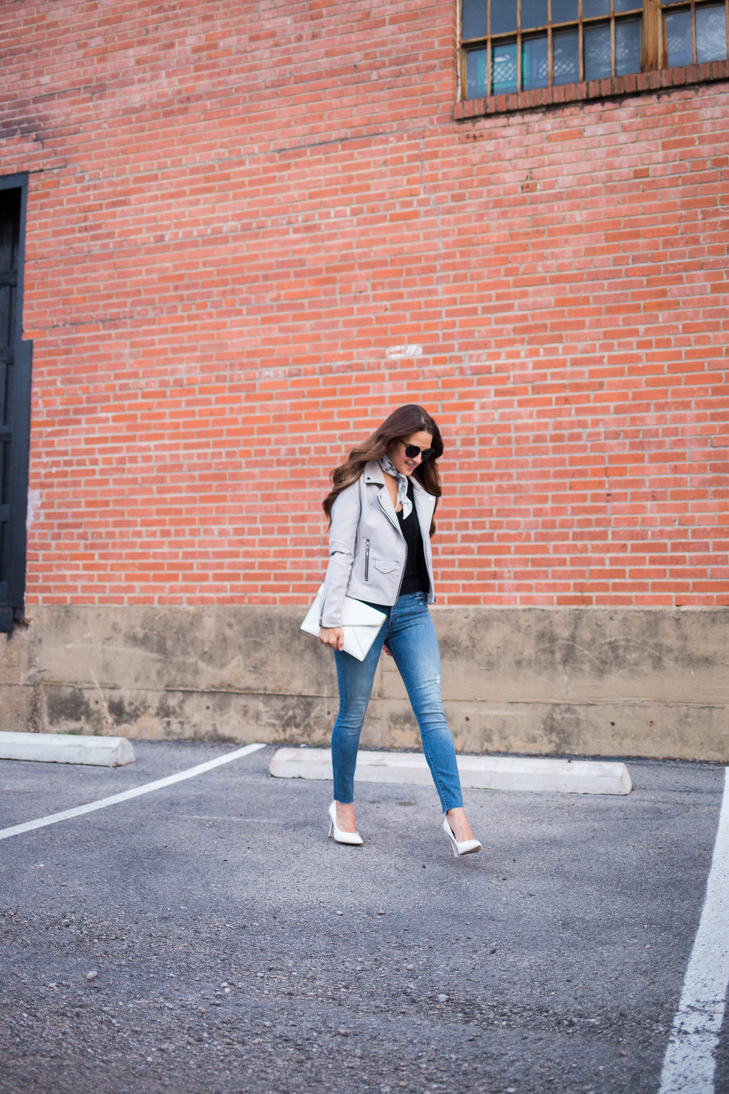 I love leather and a good vegan leather is almost even better. A light colored leather jacket is a perfect transitional piece for when the temperatures are still a little cooler. Although I wear black year round, I think that a black leather jacket, unless paired with florals or brighter colors, can be a little harsh as the temperatures rise. When I saw this light purple one, that I also have in black (duh), I didn’t think twice. The quality of this vegan leather for the price is awesome and I have gotten so much good use out of the black one since I bought it. I knew this one would be the same. I’ve already styled it so many ways, but have kept the outfits pretty simple around, as I wanted it to be the start of the outfit.