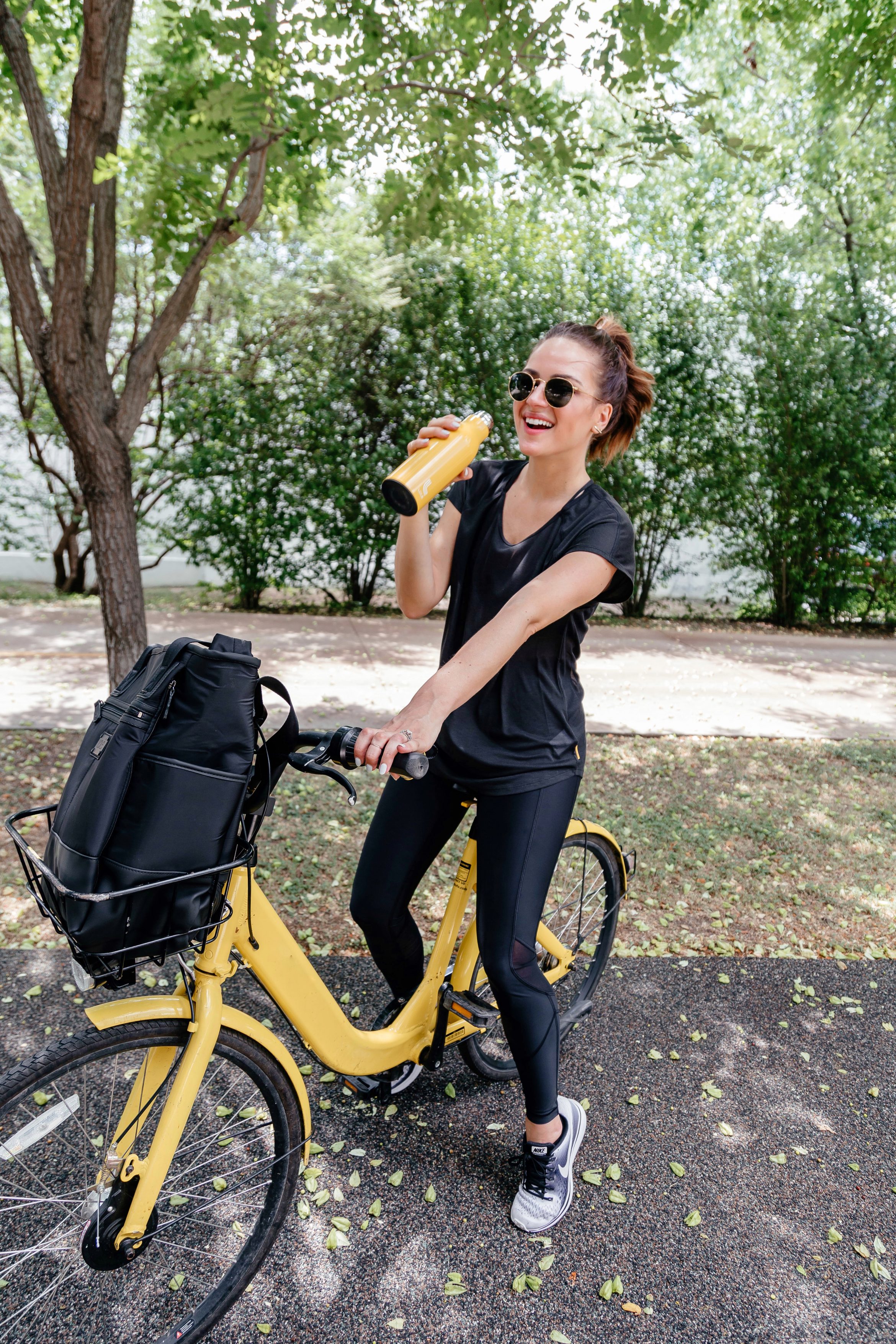 I wore this look riding bike riding around Dallas recently. We have so many amazing trails and bikes that you can pick up, rent, and drop off wherever you want, so that makes it so convenient. It was more of a day activity and a way to get in some movement while being productive and grabbing lunch than a super hard workout, but that made it more fun. This sports bra has the cutest back detail on it, has a four way stretch, is UPF (Ultraviolet Protective Factor) 35+, moisture wicking, and fits really well. It’s also eco-conscious and adheres to the bluesign © standard, which is built around five principles- resource productivity, consumer safety, air emission, water emission, and occupational health and safety. I’m wearing a small, but also could have sized up to a medium.