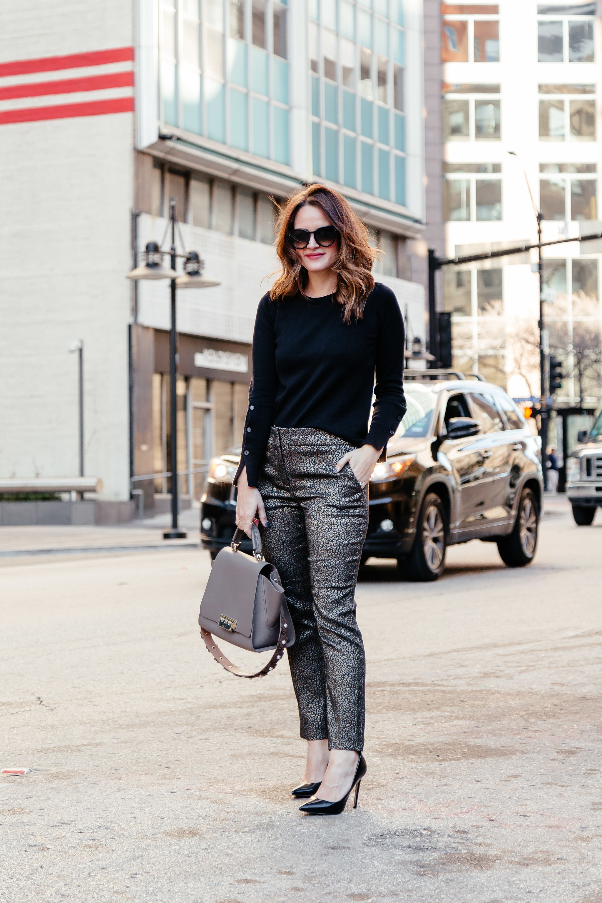 It’s Wednesday, which means another work wear look for you all! I love a good pair of tailored trousers paired with a classic pump. It’s chic, classic, and professional. I don’t like my work outfits to be too boring, because I’m often running from work to an event or a meeting with little to no time in between. I think a fun pair of pants like these allow you to trade out the sweater for a lace cami and head straight to cocktail hour. Today, I’m talking about metallic in the workplace.