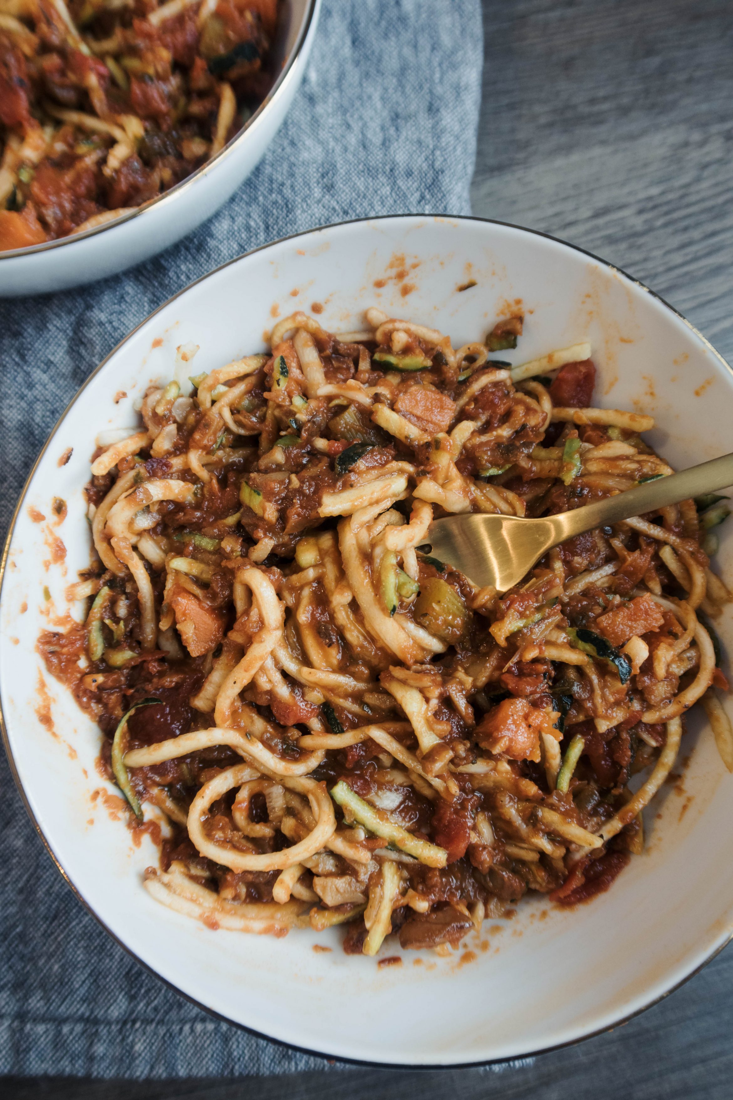 - While the sauce is simmering, spiralize your zucchinis or if you’re like me and prefer to buy containers of already cut zoodles, add those to bowls. Cover with mushroom bolognese when finished cooking and enjoy!