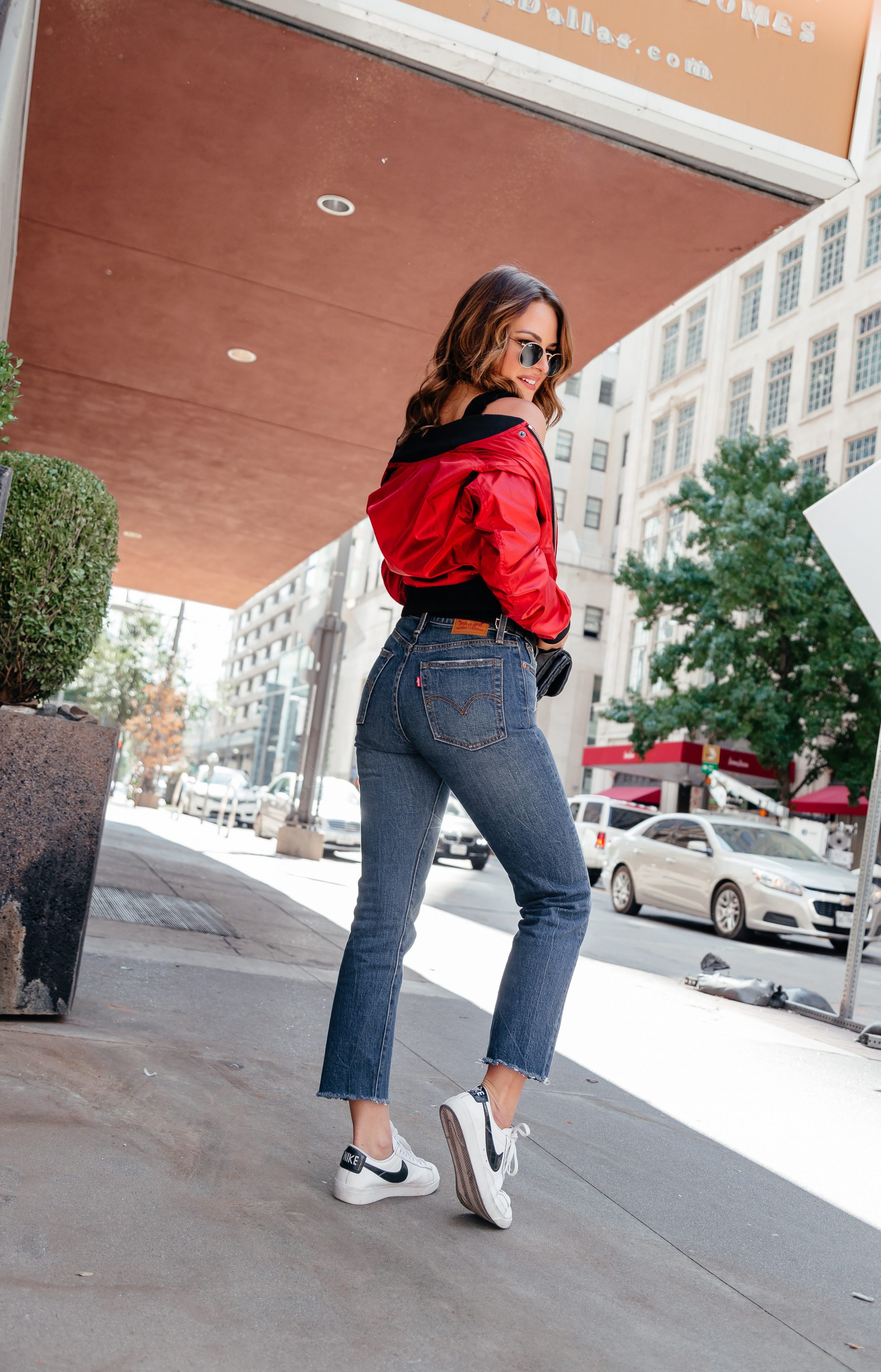 I also styled my current favorite pair of Levi jeans in a nineties inspired look. I saw this throwback style Nike bomber jacket and died over it. I paired it with a black smocked crop top and a black belt bag. I’m pretty sure belt bag is the modernized term and it would have just been called a good ole fanny back back in the nineties. I bought my usual size in these jeans, but probably could have sized up one, too.