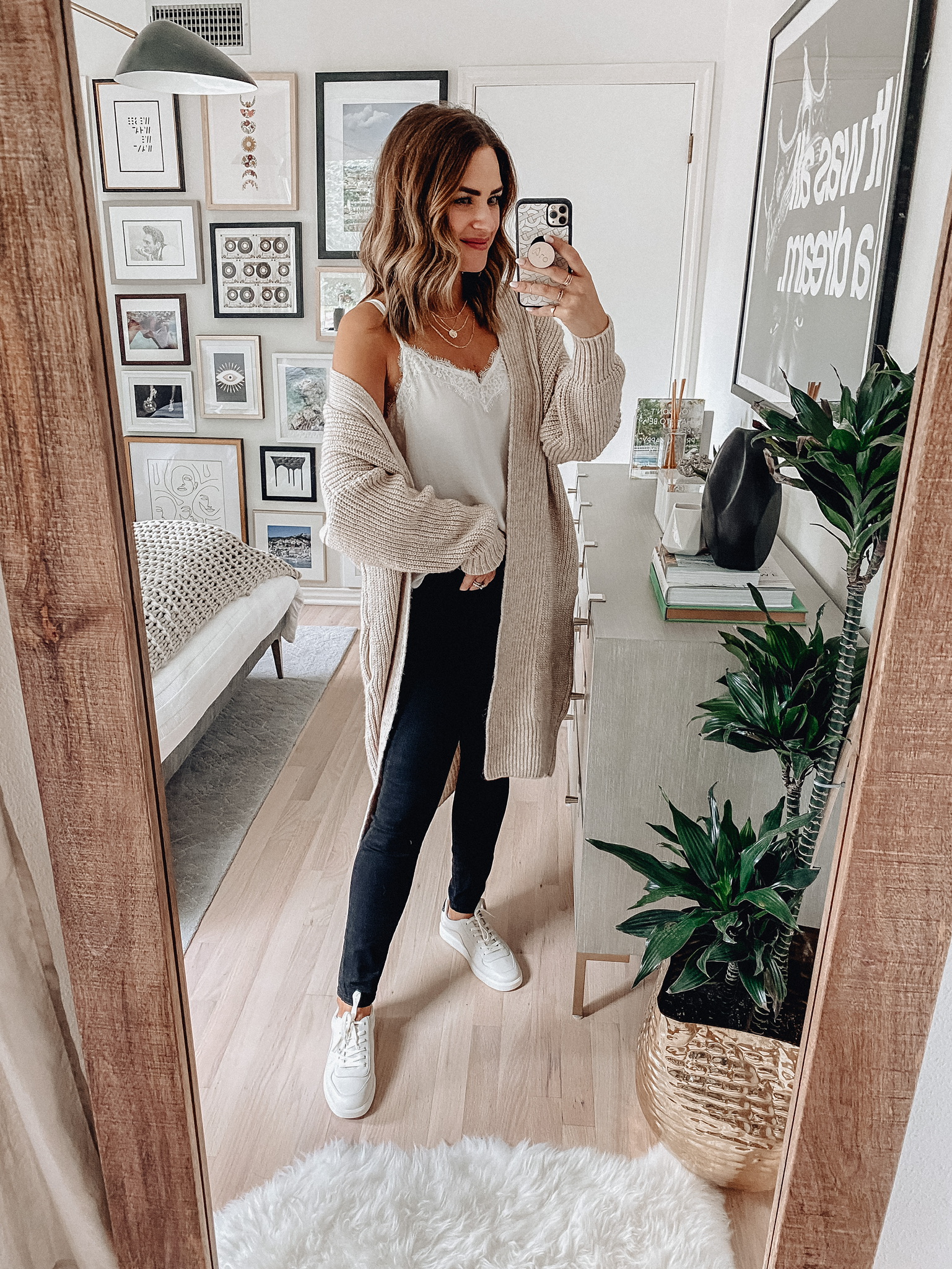 Jeans (TTS, but size up if between) // Camisole (XS, TTS) // Cardigan (US 2, runs big, size down if able) // Sneakers (TTS)