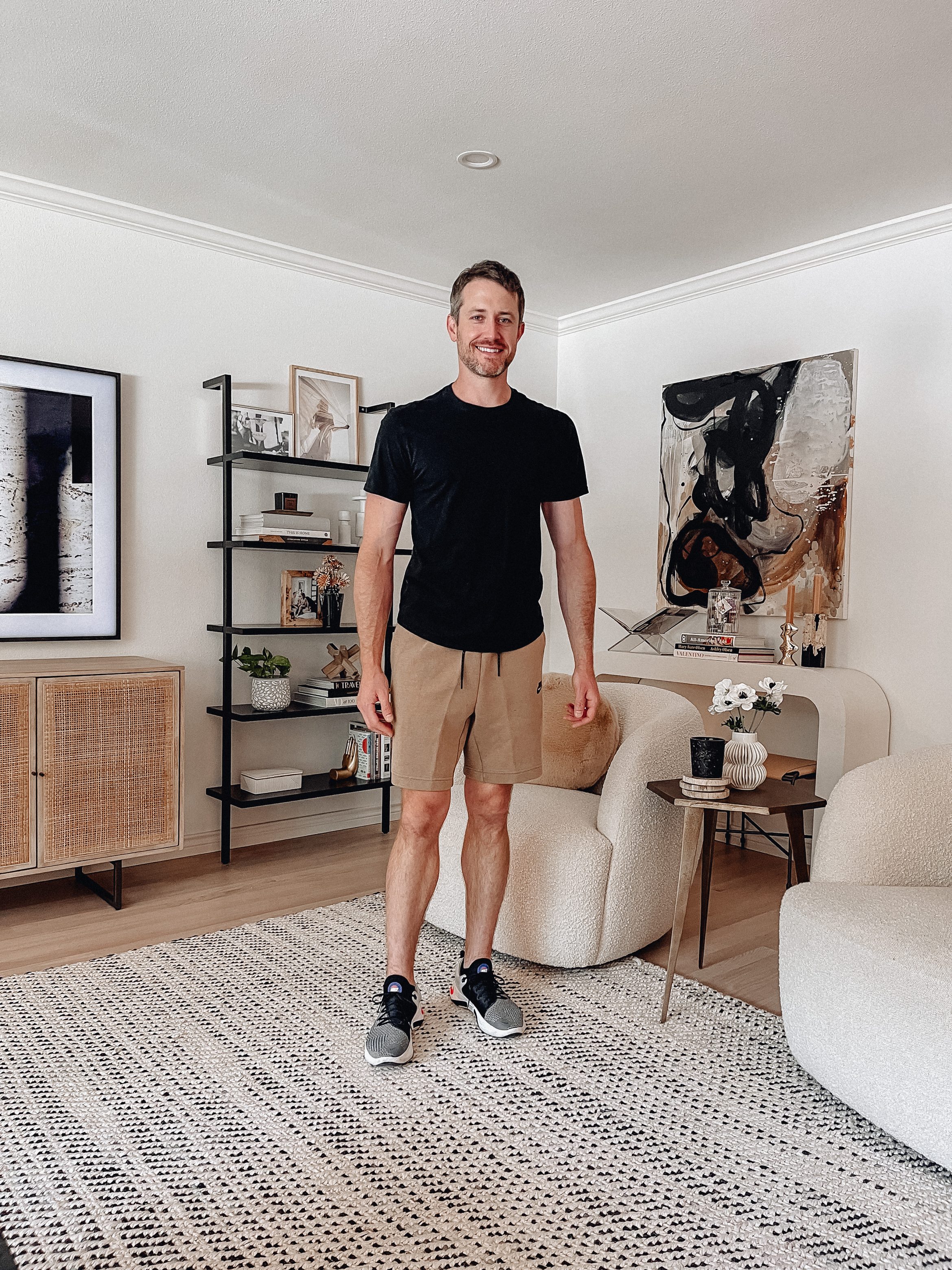 Sizing Notes for Look 1: T-shirt fits TTS. He didn’t love these shorts. They fit around the waist, but were big around his legs & on the shorter side for him. They’d be better on a guy who has larger, shorter legs or who likes shorter shorts. He sized up a 1/2 size in the sneakers, which he usually does in Nike. Sizing Notes for Look 2: Shirt & shorts fits TTS. He sized up a 1/2 size in the sneakers, which he usually does in Nike.