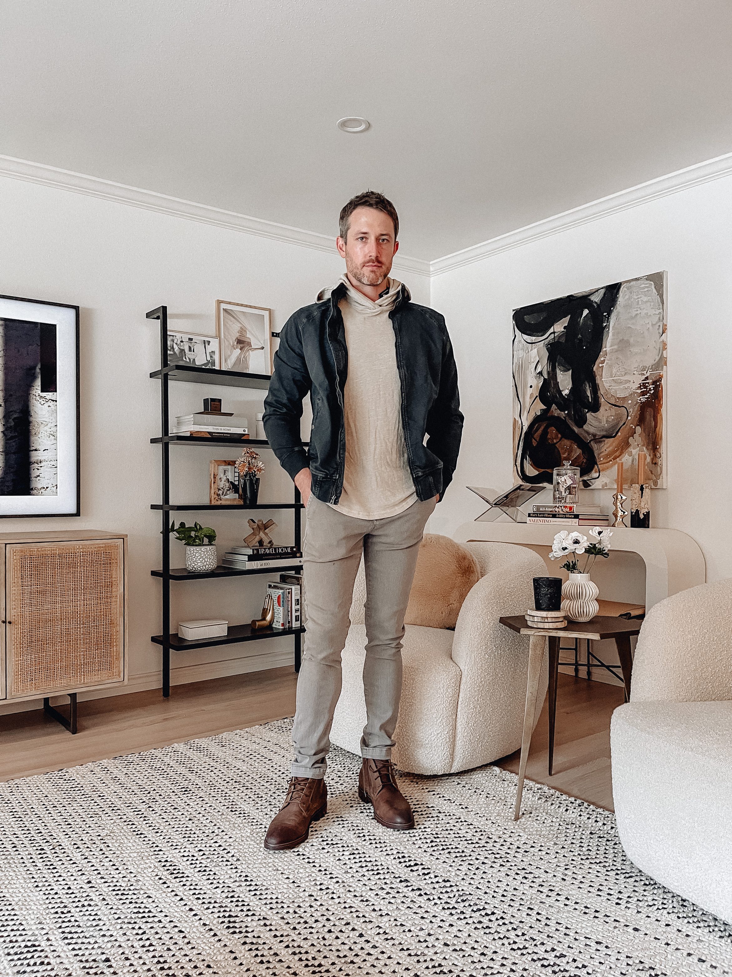 Sizing Notes for Look 1: Shirt & Jeans fit TTS. He noted the boots are a little big so he could go down a size & that they are a little stiff around the ankles, so they’d have to be broken in. Sizing Notes for Look 2: Shirt fits TTS. The jacket fits, but the arms were a little on the shorter side for him. Not worth sizing up for though! These pants weren’t his favorite fit. They were really slim through the legs on his calves, but would have been too big in the waist if he sized up. He noted the boots are a little big so he could go down a size & that they are a little stiff around the ankles, so they’d have to be broken in.