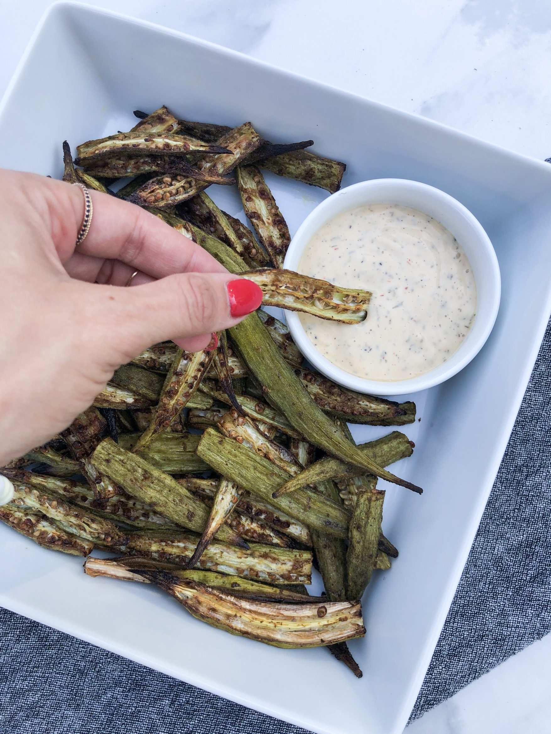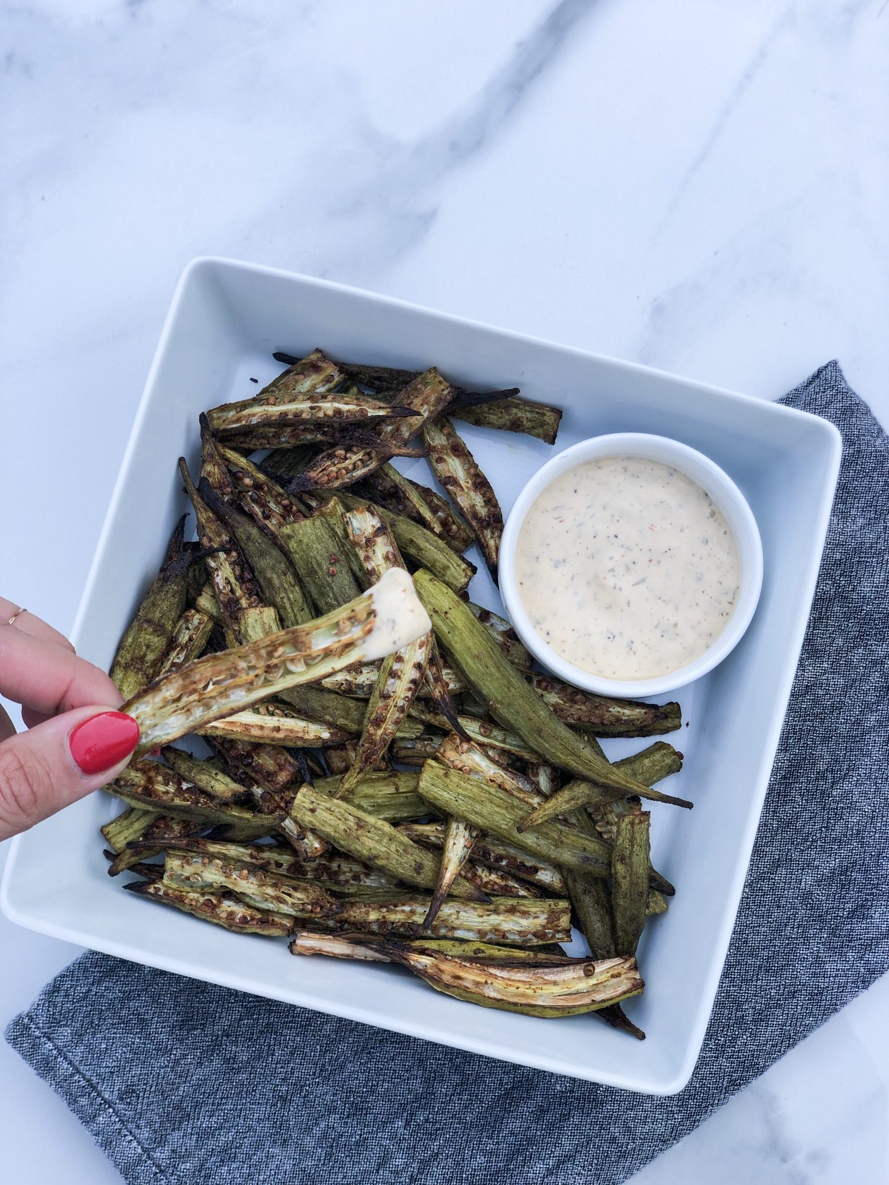 A few weeks ago when I was in NYC, Charles went over to his sister’s for dinner & said they had some okra fries that were so good. He wanted to recreate them at home & we’ve since made them a few times. We finally feel like we nailed the recipe & found the perfect dipping sauce to serve them. Today, I’m sharing our okra fries recipe with you all. They are great as an appetizer, a snack, or as a side dish. They are super easy to make & are Whole 30 approved.