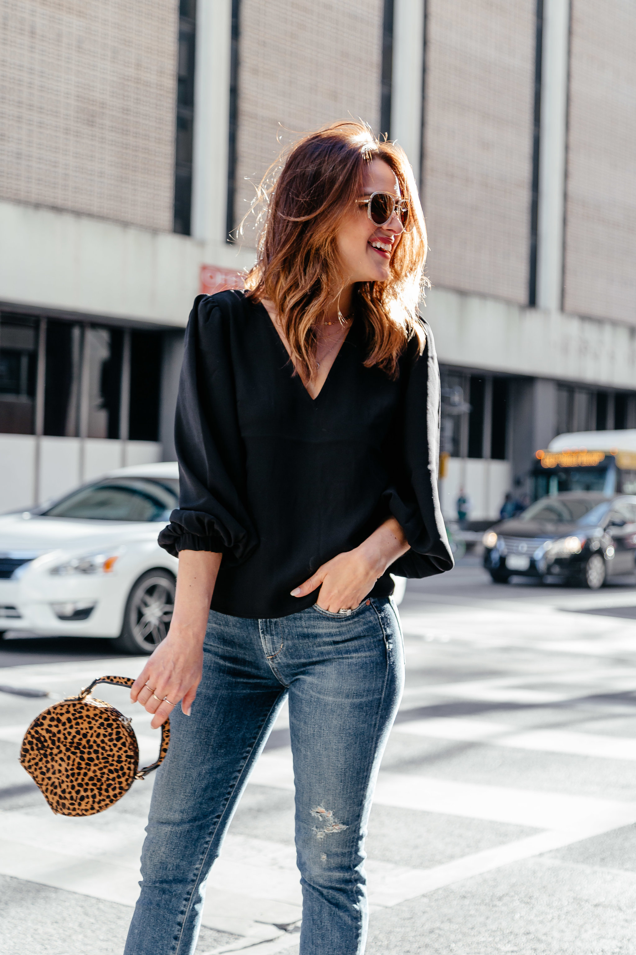 I love how well this shirt lies. The back detail gives it something interesting so it’s not just an every day black top. I also loved the V shape in the front. I paired it with high waisted, straight leg denim to ensure that any of my back showing is flattering. I wore a classic block heeled sandal and topped off the look with this fun, vintage feeling, mini leopard hat bag. I love this bag so much! I think its such a fun addition to any look and it’s a great price point!