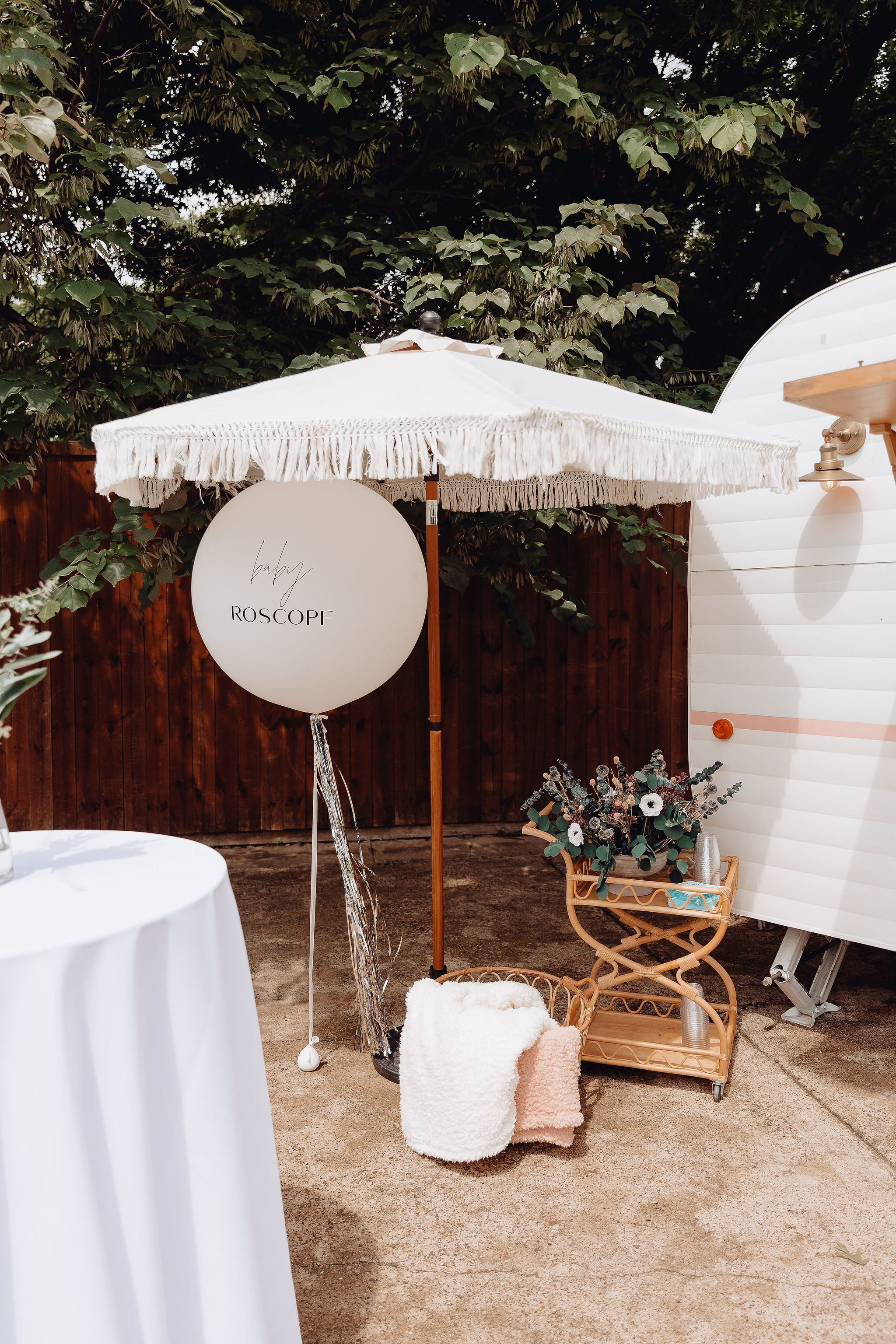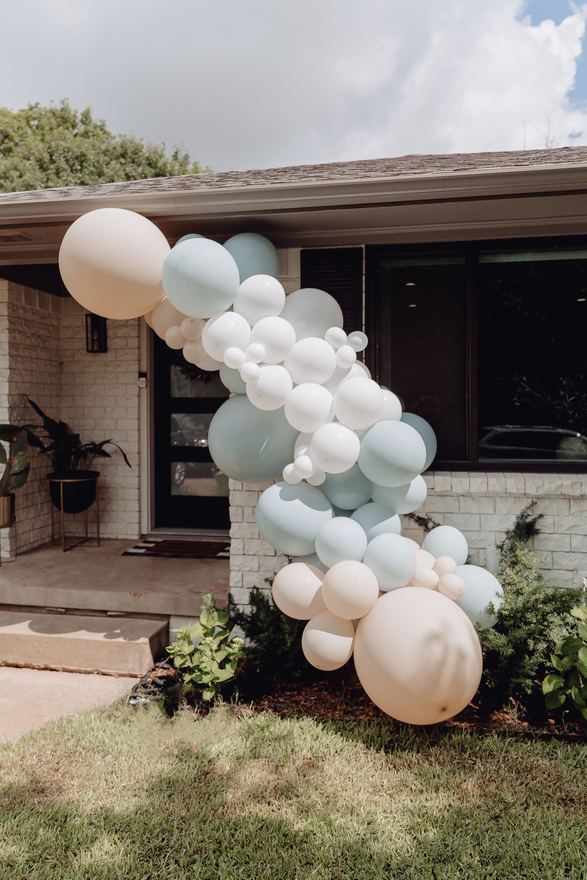 We used Lushra for the balloon arches. They did a great job of keeping everything neutral like I wanted & added in the perfect shade of ‘denim blue’ since we’re having a boy. I love denim & consider it a neutral in my wardrobe, so it worked perfectly! They did an arch on our front door to help everyone know where the party was, an arch on our gate for anyone entering or exiting the backyard that way, a large arch on the wine tap trailer, & another one on the marquee letters. They also had the cutest custom large balloon that said ‘Baby Roscopf’ on it. If you are Dallas based, Lushra can blow up all the balloons for you ahead of time & bring them to your event to install on the day of. If you aren’t local, or if you just want a DIY option, they sell their balloon kits online that you can easily do at home. They have videos with how to do it but really all you need is a balloon air pump & a little time! I’ve done the DIY arches for parties before & they are always so cute. You can use code: ALOPROFILE on their site for a discount on their DIY kits or for your next event!