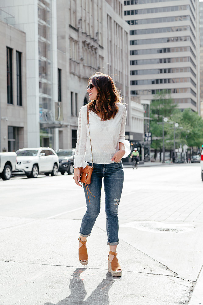 How perfect is this white top for this time of year? I love the little open back. You can layer a cami underneath it to be able to wear it to work, too. I couldn’t find it in stock on a linkable site, but you can grab it here. I linked a few other cute white tops for you all to shop!