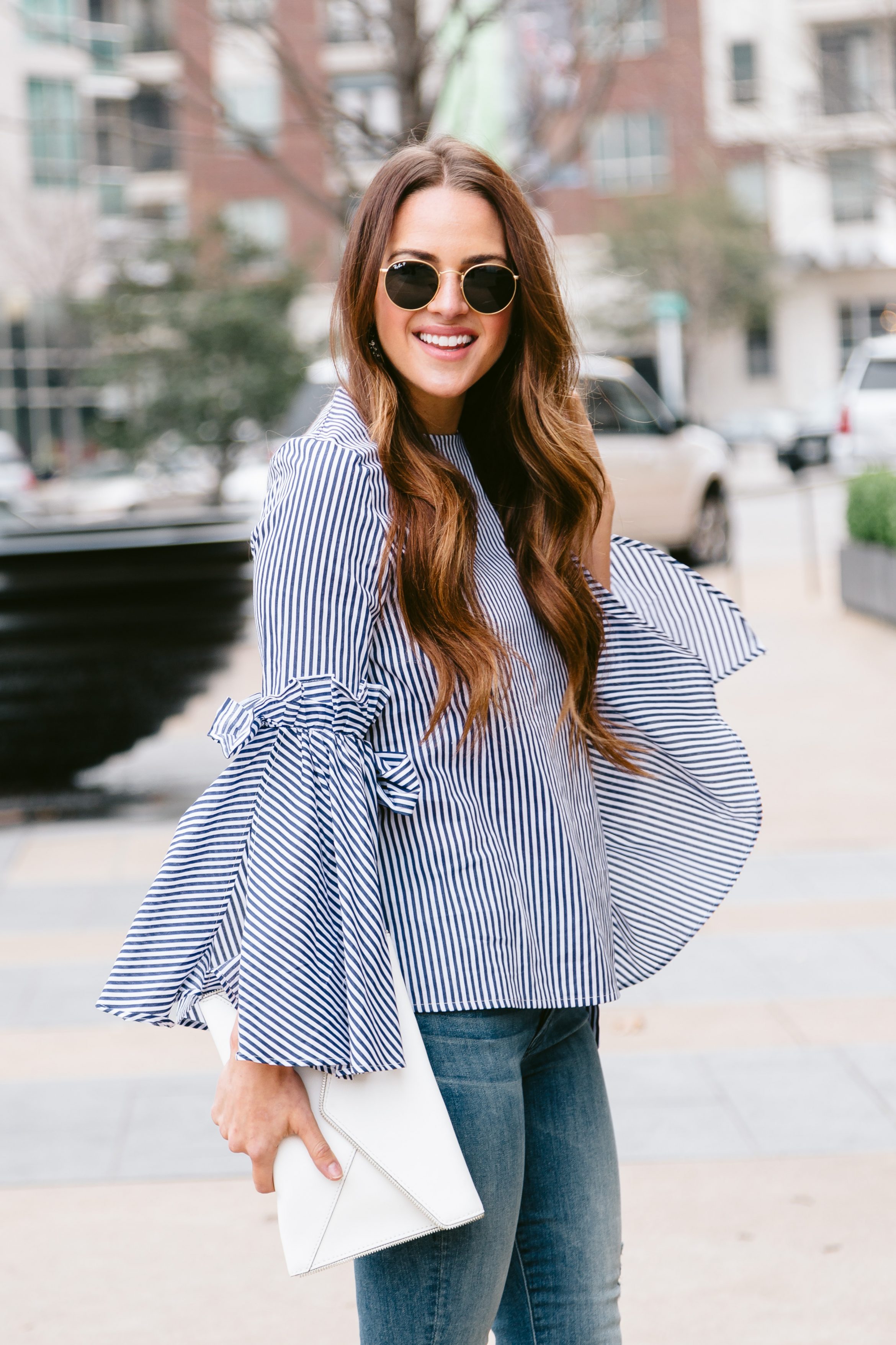 Hi Lauren, this striped top is gorgeous! The bell sleeves are on-trend and the white pumps are so chic to finish off the look 🙂