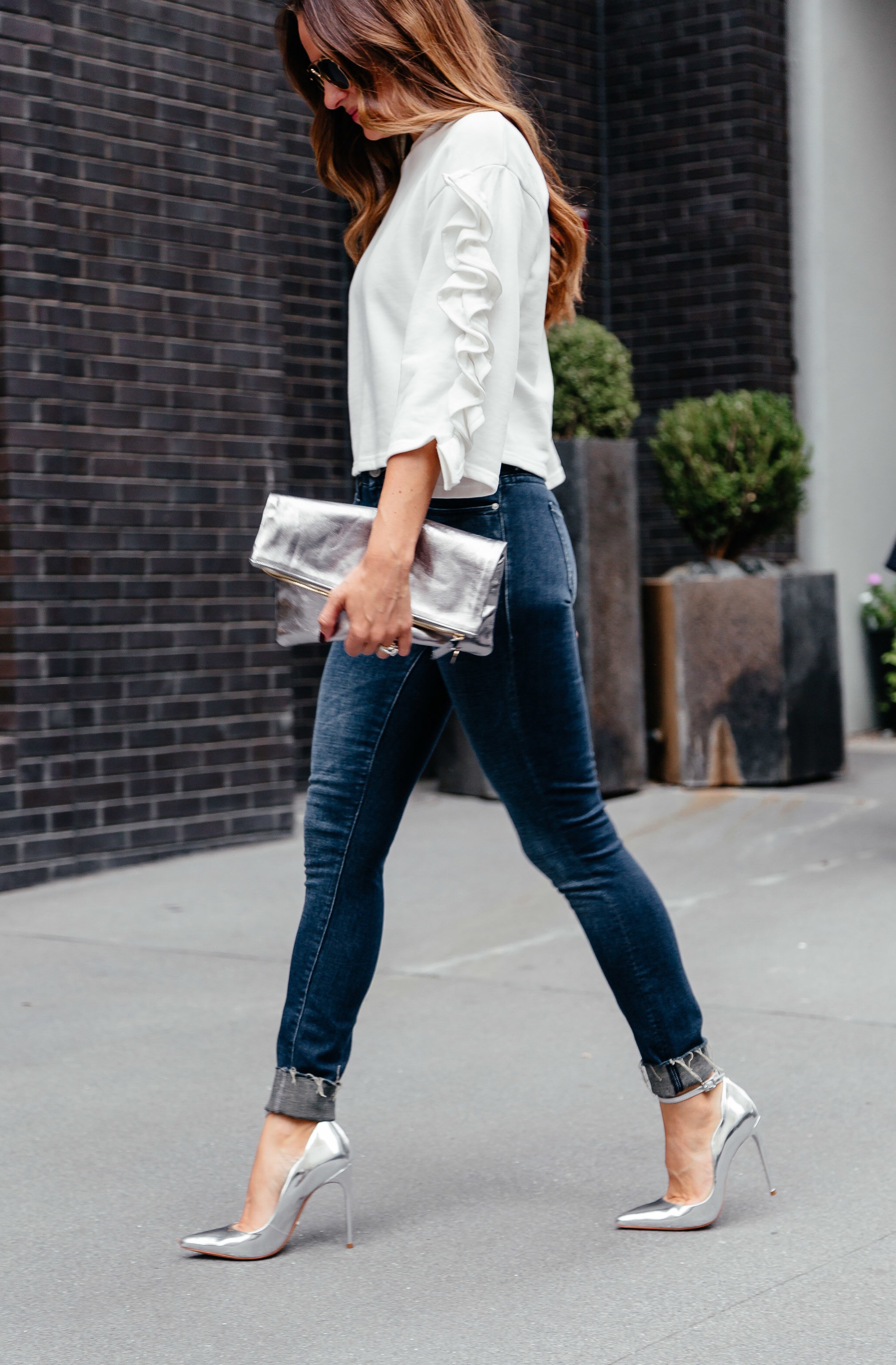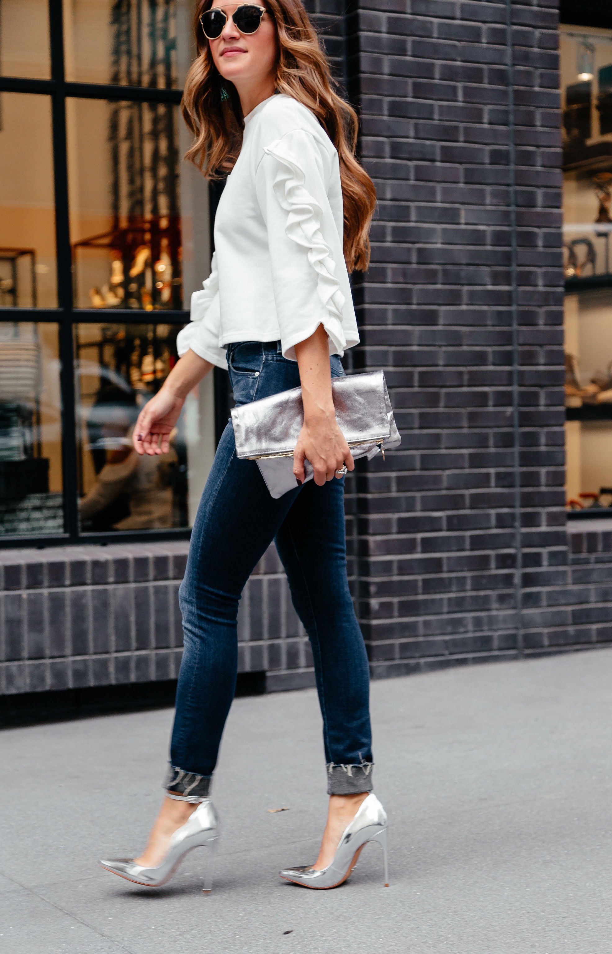 You may think I’m crazy when I talk about dressing up my sweatshirts, but hear me out. The unexpected addition of a heel, especially a statement one like these I’m wearing, is so fun to me. I love that the rest of the look is so simple and casual and that you can take it from daytime with sneakers to a casual night out by adding a heel and swapping out your bag. I went with these metallic pumps and a matching clutch for this look. I’m obsessed with both and metallics are a huge trend for Fall this year. I added a little color with these greenish tassel earrings that I love. They are the perfect for this time of year and I’ve been wearing them on repeat. They seriously come in like twelve colors! These jeans are one of my absolute favorite brands– for sure look into them if you haven’t tried them. All of the styles I have bought run true to size and are so comfortable!
