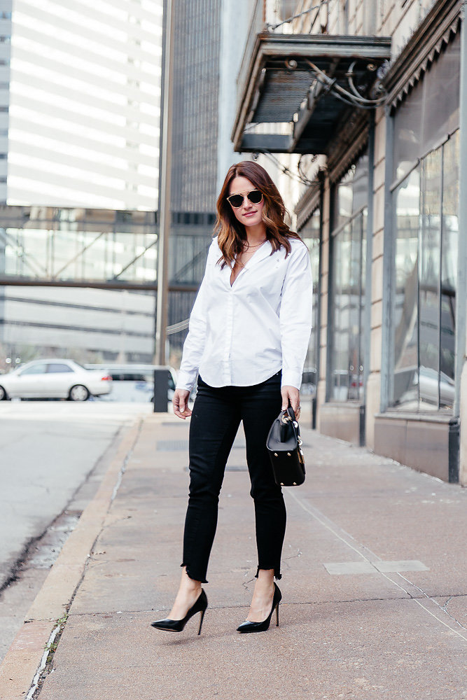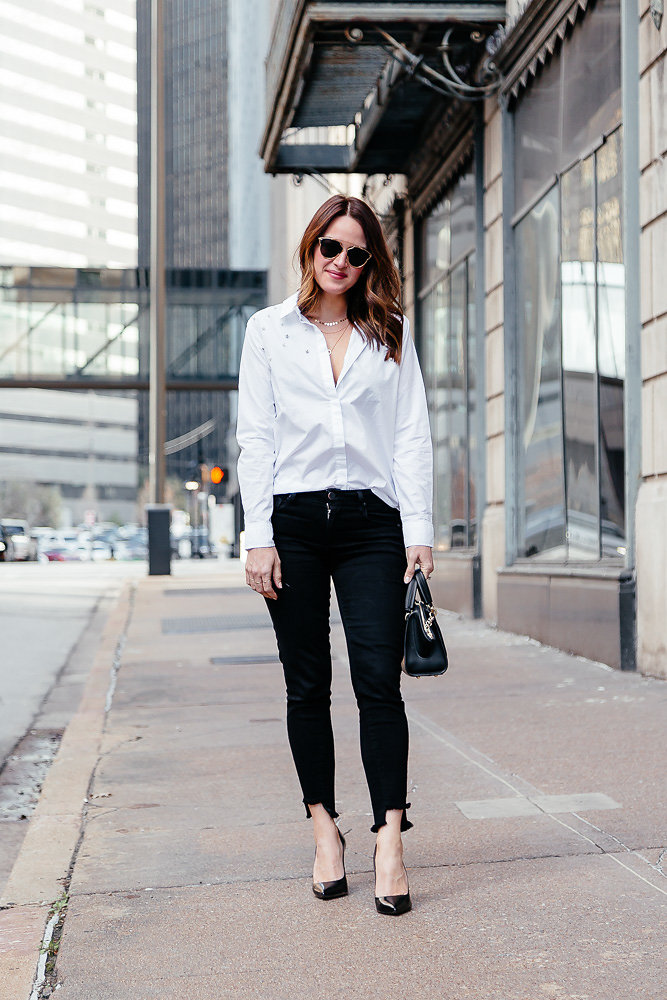 The same applies to these black skinny jeans. The raw hem is a little more uneven and dramatic than some other pairs I own. I like it because it just screams to be paired with a heel or a fun bootie. I wore a classic black pump here, but I have a fun metallic pair that would also look fun or I think even a bright colored pair would look great. A pair of booties in any color would also look great. Switching up your shoes with a classic pairing like this is a fun way to keep it feeling fresh. I can’t count the number of times I’ve worn a white button down with black skinny jeans, but I keep styling the look different ways or adding in pieces with a fun twist like these so I don’t get bored with the look. Switching out your accessories is another fun way to keep the look feeling new and different.