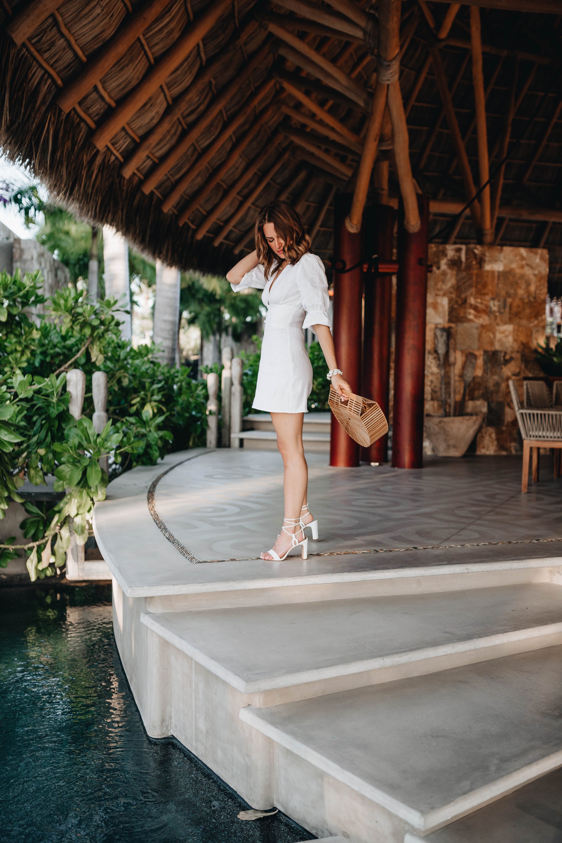 This little white dress is another one I wore in Punta Mita. I love the linen material on this one. It makes it so effortless & perfect for warmer weather. The lower cut & the button detail is beautiful. I dressed it up here, but I think it looks great dressed down with sandals or sneakers, too. If you’re a bride, I love this for a shower. If you aren’t, it’s perfect for an every day white dress or for date night!