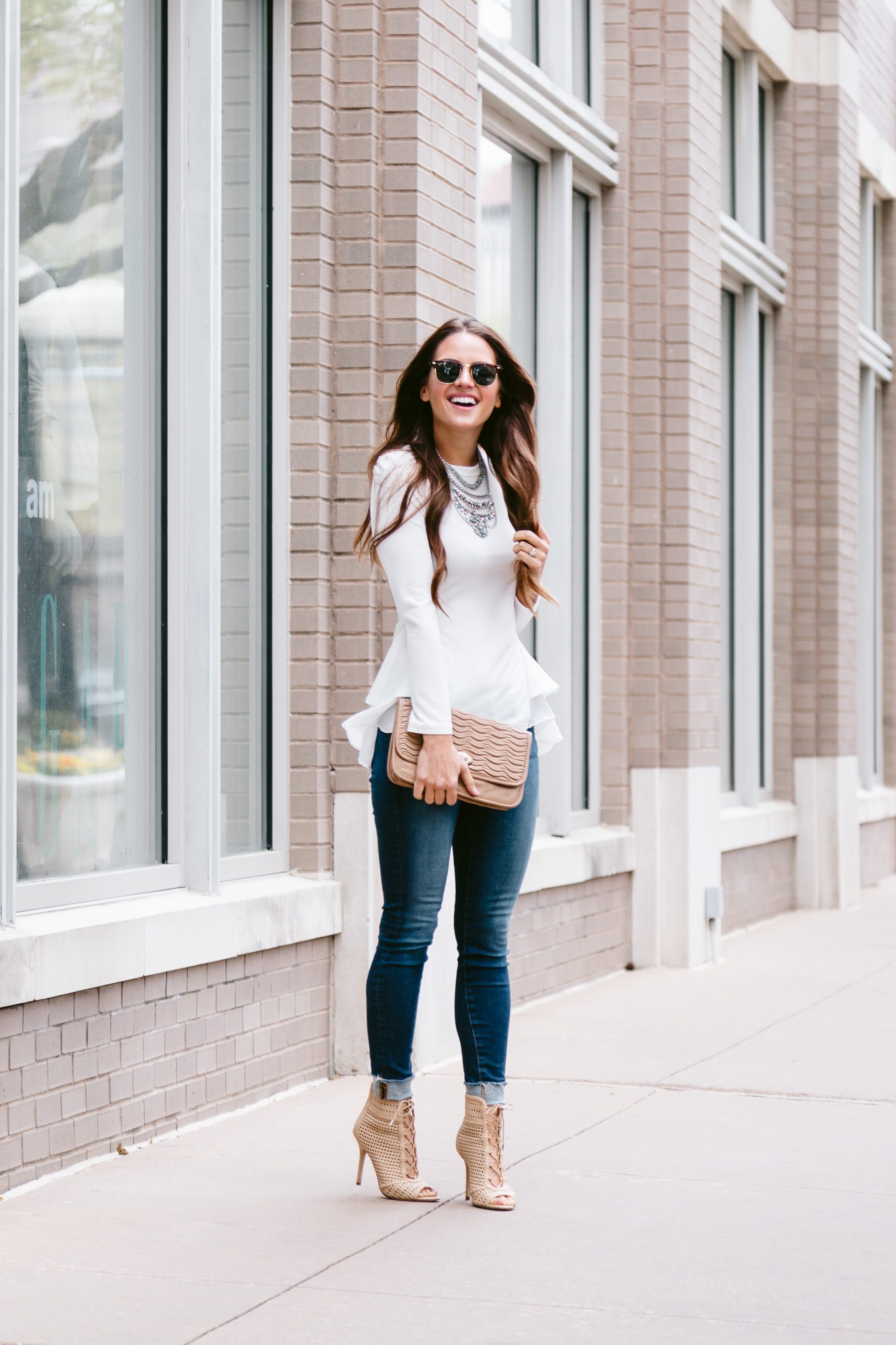 It’s all in the details my friends. This top is proof of that! This otherwise simple white long-sleeve top has the most gorgeous tiered peplum detailing on the bottom. The fabric is light and can easily be worn throughout warmer months or layered on top of when its cooler outside. You can wear it to work with black pants or a pencil skirt and out with short or jeans.
